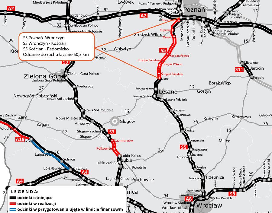 Droga ekspresowa S5 w tym roku połączy Poznań z Wrocławiem, a w 2022 r. będzie można przejechać nią od autostrady A1 w okolicy Grudziądza aż do autostrady A8 na obwodnicy Wrocławia. W docelowym układzie połączy się z drogą ekspresową S7 pod Ostródą, a w dalszej perspektywie poprzez S51, S16, S61 i z wykorzystaniem planowanej S10 utworzy dodatkowy ciąg dróg ekspresowych w północnej Polsce na linii wschód - zachód.