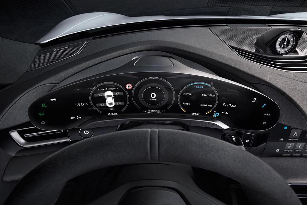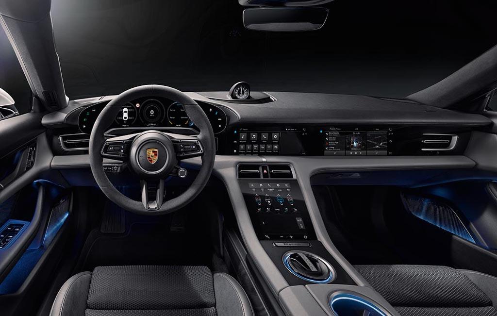 Sporo nowych rozwiązań znajdziemy w kabinie elektrycznego Porsche z wolnostojącym, zakrzywionym panelem wskaźników na czele. Centralnie umieszczony 10,9-calowy wyświetlacz inforozrywki połączono z opcjonalnym ekranem dla pasażera, tworząc zintegrowany szklany pas. Całkowicie od nowa zaprojektowano wszystkie interfejsy, zredukowane też do minimum liczbę klasycznych przełączników i przycisków. Obsługa systemów pokładowych odbywa się za pomocą paneli dotykowych lub poprzez funkcję sterowania głosowego, która reaguje na polecenie „Hej Porsche”.