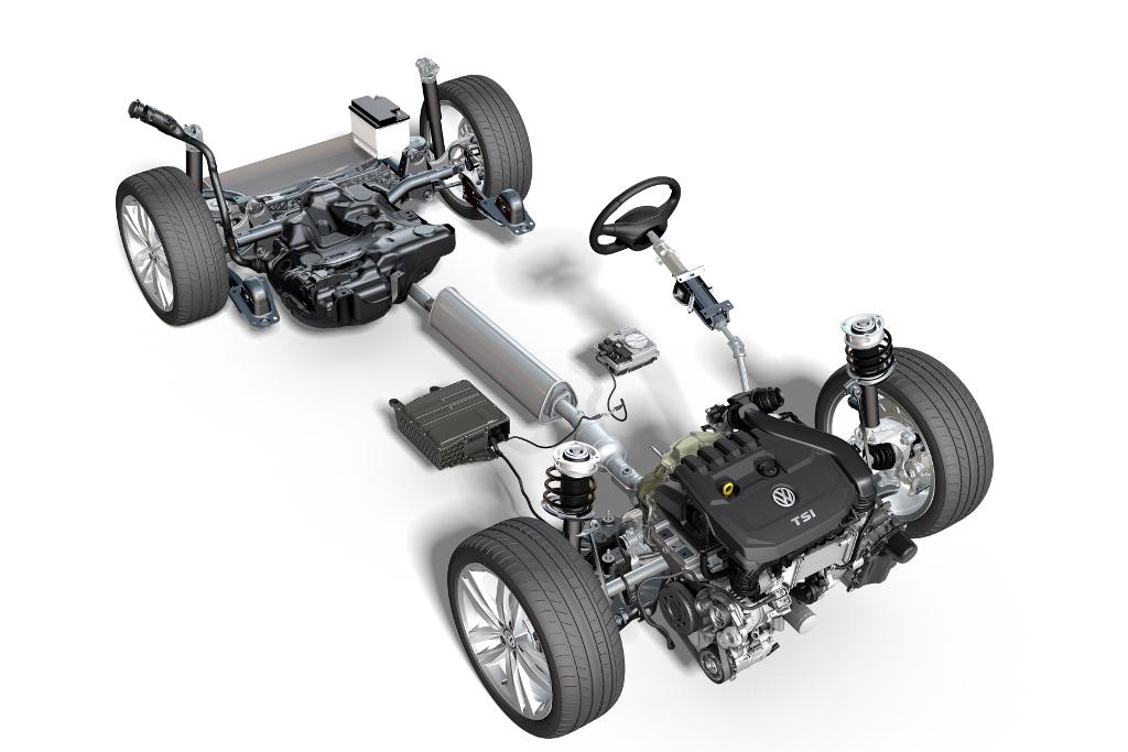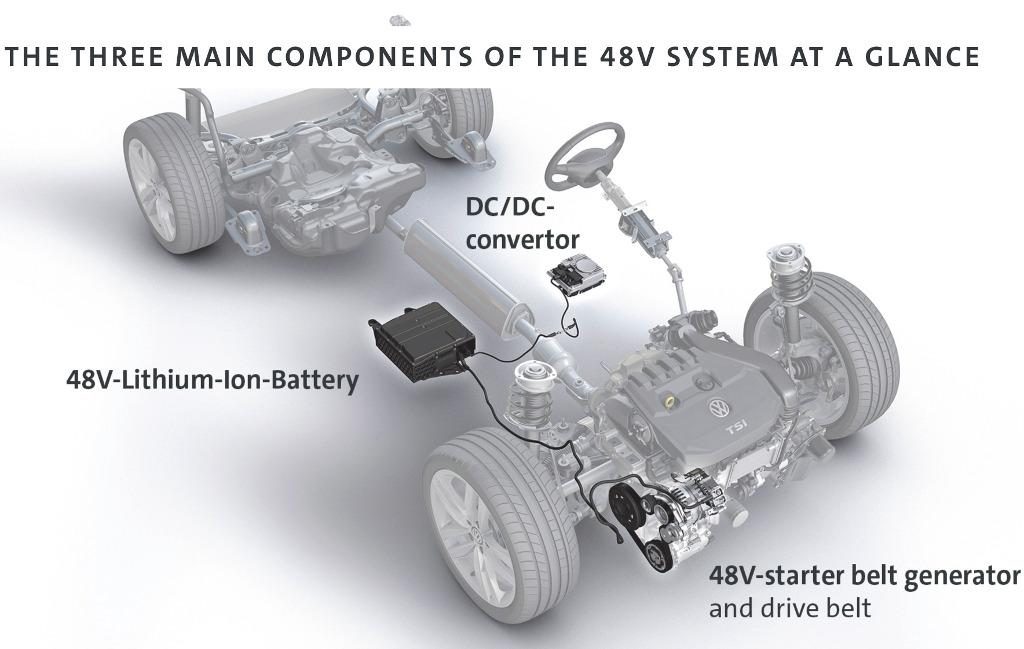 W porównaniu do hybryd typu plug-in (PHEV), np. Golfa GTE i Passata GTE, wprawdzie technologia 48V w hybrydzie typu mHEV jest bardziej ograniczony, za to rozwiązanie to jest znacznie oszczędniejsze. W hybrydzie mHEV nie ma akumulatora ładowanego z gniazdka, za to jest silnik elektryczny o napięciu 48V, który może działać jako rozrusznik połączony paskiem z kołem na wale korbowym silnika spalinowego. Zadaniem silnika elektrycznego jest wspieranie pracy spalinowej jednostki napędowej, by w określonych sytuacjach – np. podczas wyprzedzania – zwiększać moc całego układu napędowego.