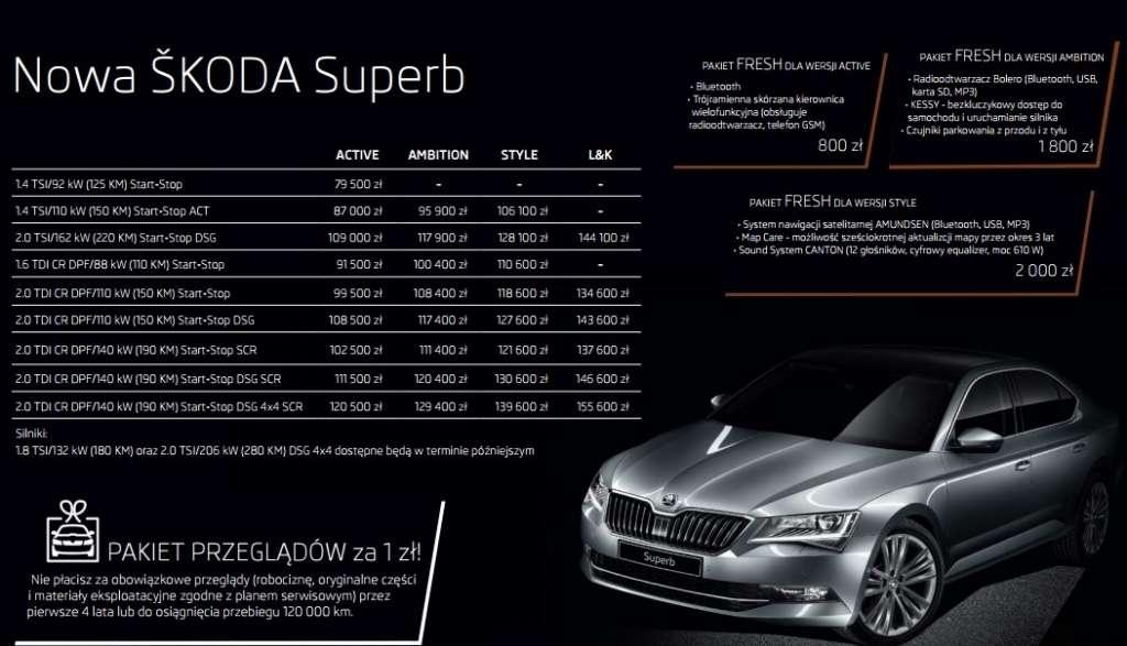 Przy okazji Poznań Motor Show 2015 wielu producentów postanowiło opublikować cenniki nowych modeli. Podobnie postąpiła Skoda, która poinformowała o cenie wszystkich wariantów modelu Superb.