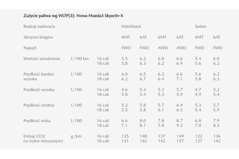 2-litrowy silnik Skyactiv-X jest pierwszą na świecie seryjnie produkowaną jednostką napędową łączącą zapłon iskrowy silnika benzynowego z zapłonem samoczynnym, jaki posiadają silniki Diesla. W nowej generacji Mazdy 3 jednostka ta generuje moc 180 KM i 224 Nm maksymalnego momentu obrotowego. Nowa Mazda 3 Skyactiv-X z nadwoziem sedan osiąga zużycie paliwa zaledwie 4,3 l/100 km przy emisji CO2 96 g/km.