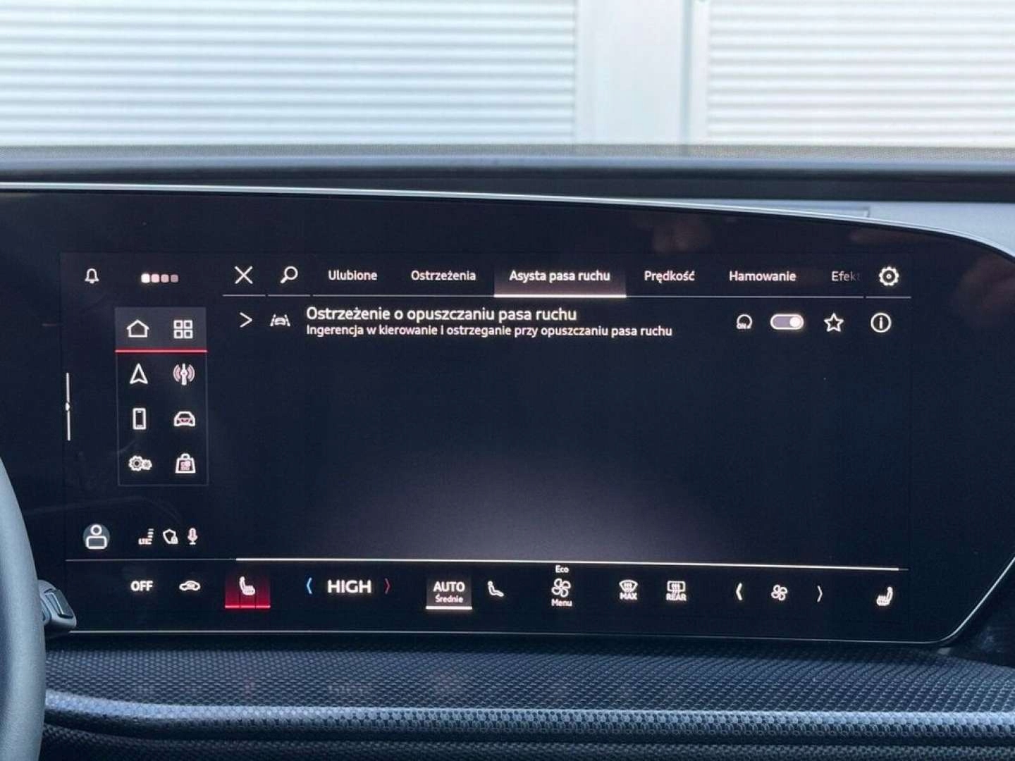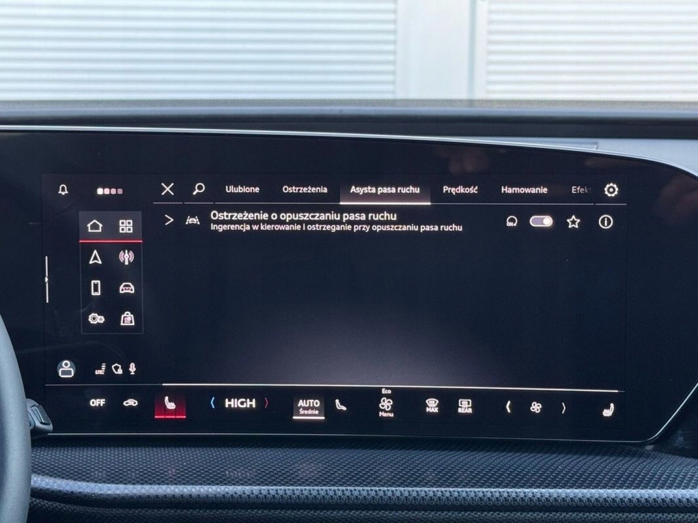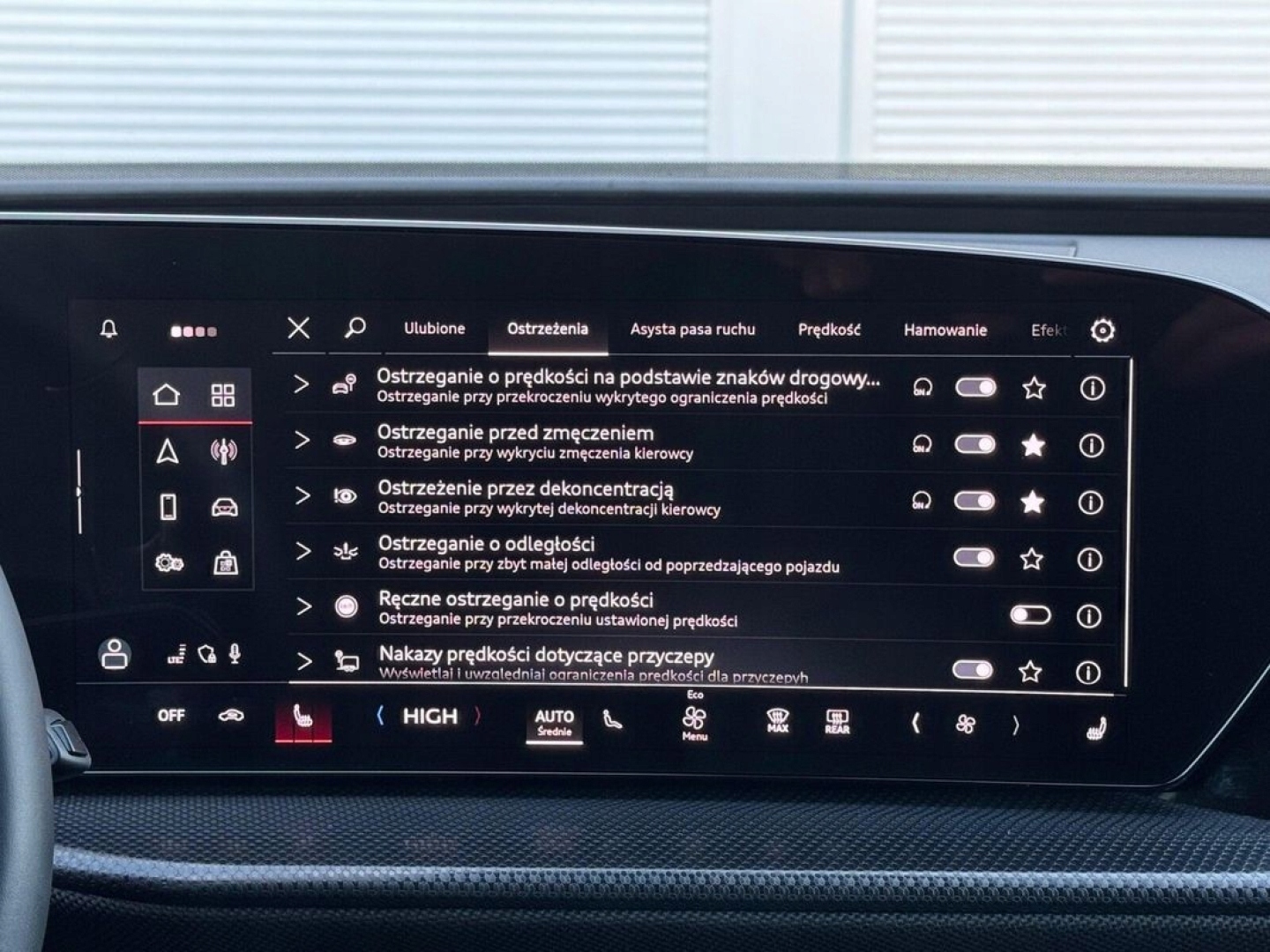 ABS, ASR (kontrola trakcji), Asystent pasa ruchu, Czujnik deszczu, Czujniki parkowania przednie, Czujniki parkowania tylne, ESP (stabilizacja toru jazdy), Kamera cofania, Kurtyny powietrzne, Poduszka powietrzna kierowcy, Poduszka powietrzna pasażera, Poduszki boczne przednie, Poduszki boczne tylne, Elektryczne szyby przednie, Elektryczne szyby tylne, Elektrycznie ustawiane fotele, Elektrycznie ustawiane lusterka, Podgrzewane lusterka boczne, Podgrzewane przednie siedzenia, Podgrzewane tylne siedzenia, Przyciemniane szyby, Tapicerka tekstylna, Wielofunkcyjna kierownica, Wspomaganie kierownicy, Skórzana kierownica, Bluetooth, Gniazdo USB, Nawigacja GPS, Radio fabryczne, Alufelgi, Bezkluczykowy dostęp, Elektrochromatyczne lusterka boczne, Ogranicznik prędkości, System Start-Stop, Tempomat aktywny