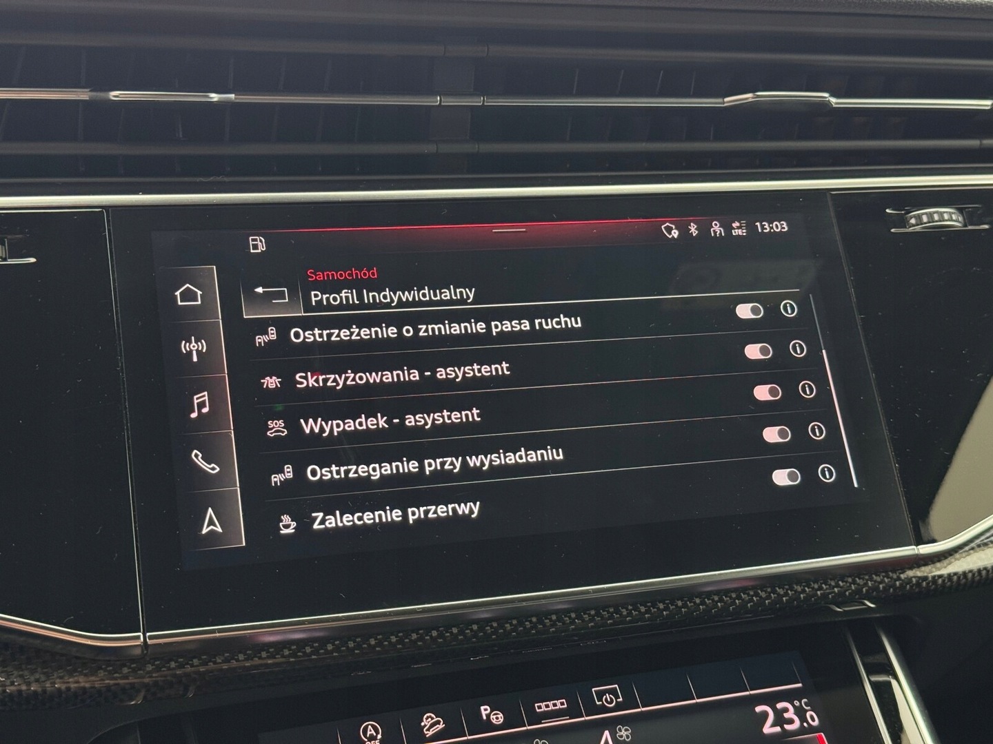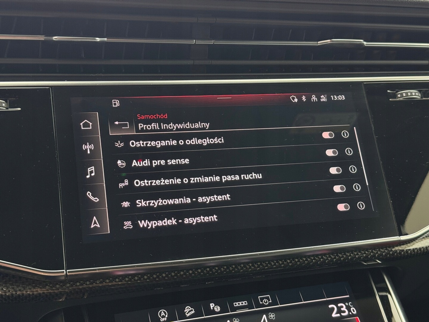 Czujnik deszczu, Czujnik martwego pola, Czujnik zmierzchu, Kamera cofania, Czujniki parkowania przednie, Czujniki parkowania tylne, Asystent parkowania, ABS, Poduszki boczne przednie, ESP (stabilizacja toru jazdy), Isofix, Poduszka powietrzna kierowcy, Poduszka powietrzna pasażera, Elektryczne szyby przednie, Elektryczne szyby tylne, Elektrycznie ustawiane fotele, Podgrzewane przednie siedzenia, Przyciemniane szyby, Elektrycznie ustawiane lusterka, Podgrzewane lusterka boczne, Wspomaganie kierownicy, Zawieszenie adaptacyjne, Bluetooth, Gniazdo USB, Radio niefabryczne, Nawigacja GPS, Dach panoramiczny, Łopatki zmiany biegów, Ogranicznik prędkości, System Start-Stop, Tempomat aktywny, Alufelgi