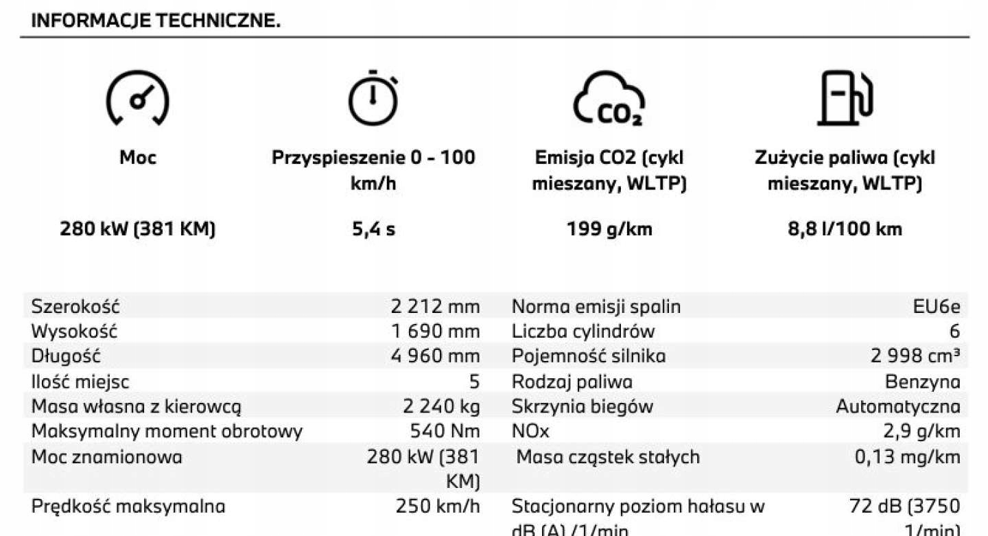 ABS, Alarm, ASR (kontrola trakcji), Asystent parkowania, Asystent pasa ruchu, Czujnik deszczu, Czujnik martwego pola, Czujnik zmierzchu, ESP (stabilizacja toru jazdy), HUD (wyświetlacz przezierny), Isofix, Kamera cofania, Kurtyny powietrzne, Poduszka powietrzna kierowcy, Poduszka powietrzna pasażera, Poduszki boczne przednie, Poduszki boczne tylne, Elektryczne szyby przednie, Elektryczne szyby tylne, Elektrycznie ustawiane fotele, Elektrycznie ustawiane lusterka, Ogrzewanie postojowe, Podgrzewana kierownica, Podgrzewane lusterka boczne, Podgrzewane przednie siedzenia, Podgrzewane tylne siedzenia, Przyciemniane szyby, Wentylowane fotele, Wielofunkcyjna kierownica, Wspomaganie kierownicy, Skórzana kierownica, Bluetooth, Gniazdo USB, Nawigacja GPS, Radio fabryczne, Alufelgi, Bezkluczykowy dostęp, Elektrochromatyczne lusterka boczne, Łopatki zmiany biegów, Ogranicznik prędkości, System Start-Stop, Tempomat aktywny