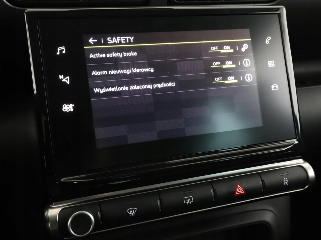 ABS, ASR (kontrola trakcji), Czujnik deszczu, Czujniki parkowania tylne, Immobilizer, Asystent pasa ruchu, Poduszka powietrzna kierowcy, Poduszka powietrzna pasażera, Poduszki boczne przednie, ESP (stabilizacja toru jazdy), Isofix, Elektryczne szyby przednie, Elektryczne szyby tylne, Elektrycznie ustawiane lusterka, Przyciemniane szyby, Wielofunkcyjna kierownica, Wspomaganie kierownicy, Tapicerka tekstylna, Bluetooth, Gniazdo USB, Radio fabryczne, Nawigacja GPS, Centralny zamek, Komputer pokładowy, Relingi dachowe, Tempomat