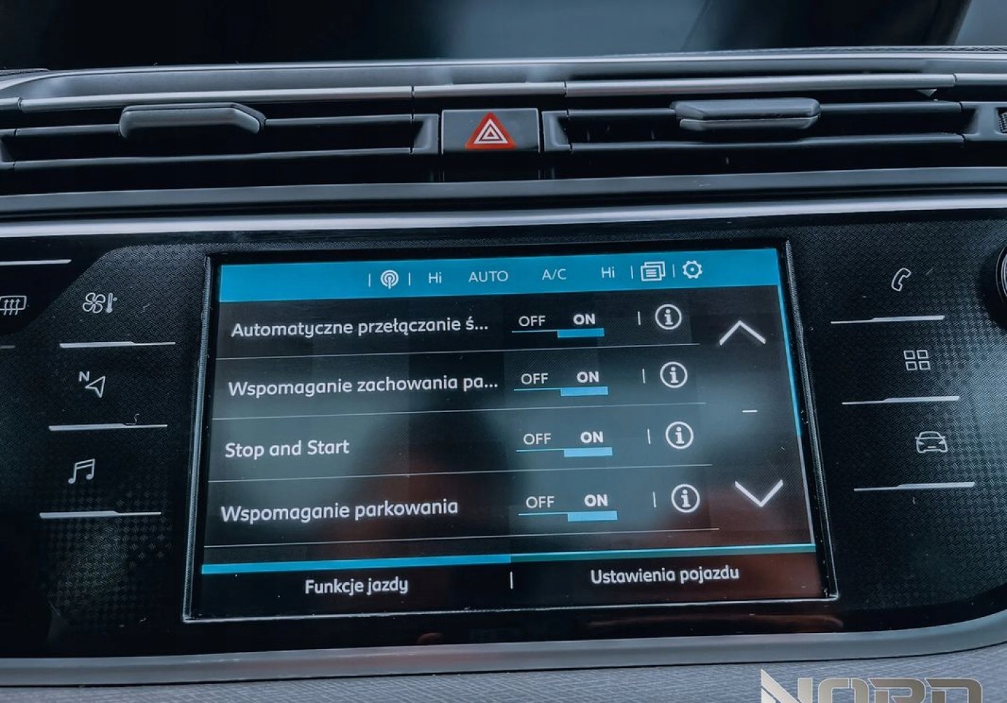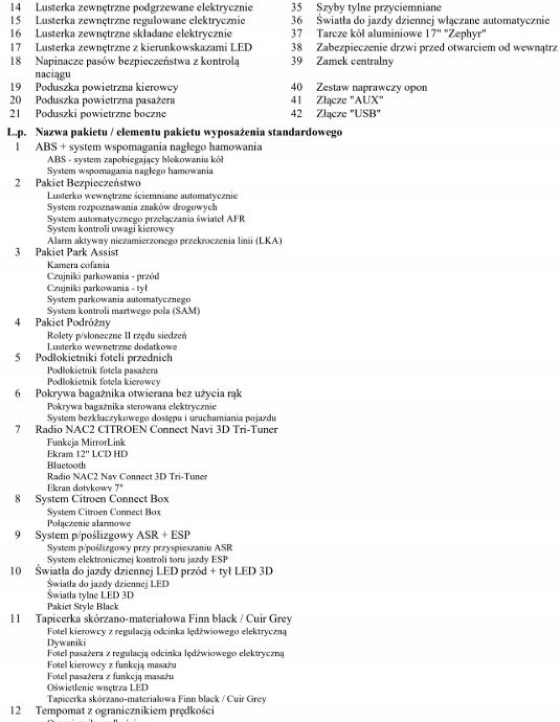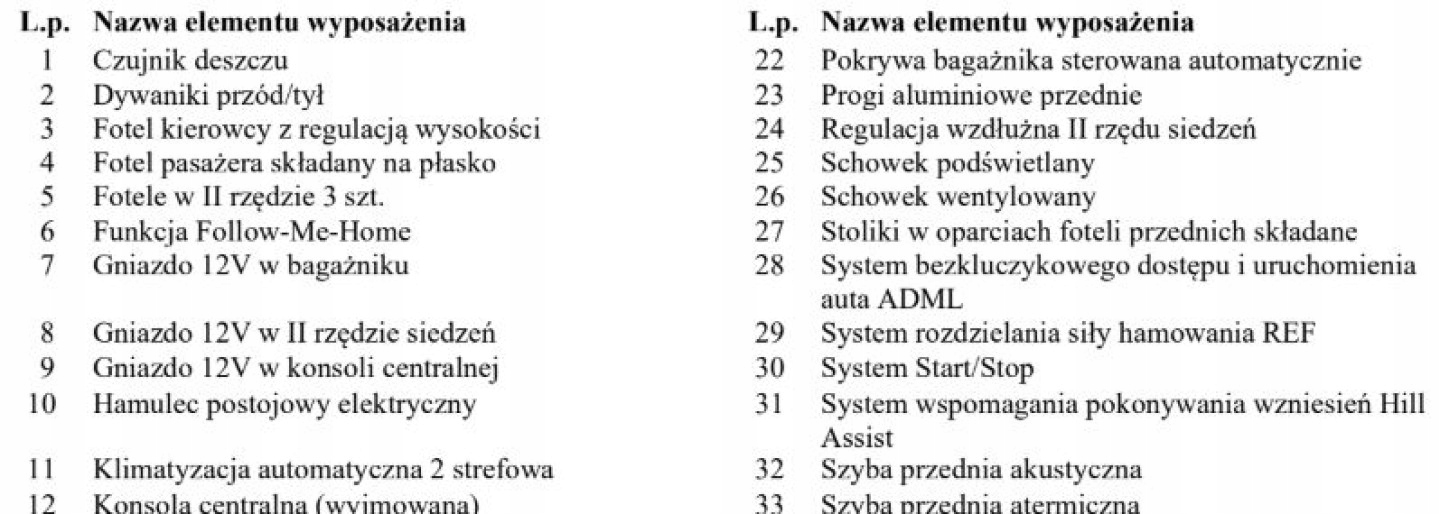 ASR (kontrola trakcji), Asystent parkowania, Czujnik deszczu, Czujniki parkowania przednie, Czujniki parkowania tylne, ESP (stabilizacja toru jazdy), Kamera cofania, Kurtyny powietrzne, Poduszki boczne przednie, Poduszki boczne tylne, Elektrycznie ustawiane lusterka, Podgrzewane lusterka boczne, Przyciemniane szyby, Tapicerka tekstylna, Bluetooth, Gniazdo USB, Nawigacja GPS, Radio fabryczne, Elektrochromatyczne lusterka boczne, Ogranicznik prędkości, Tempomat