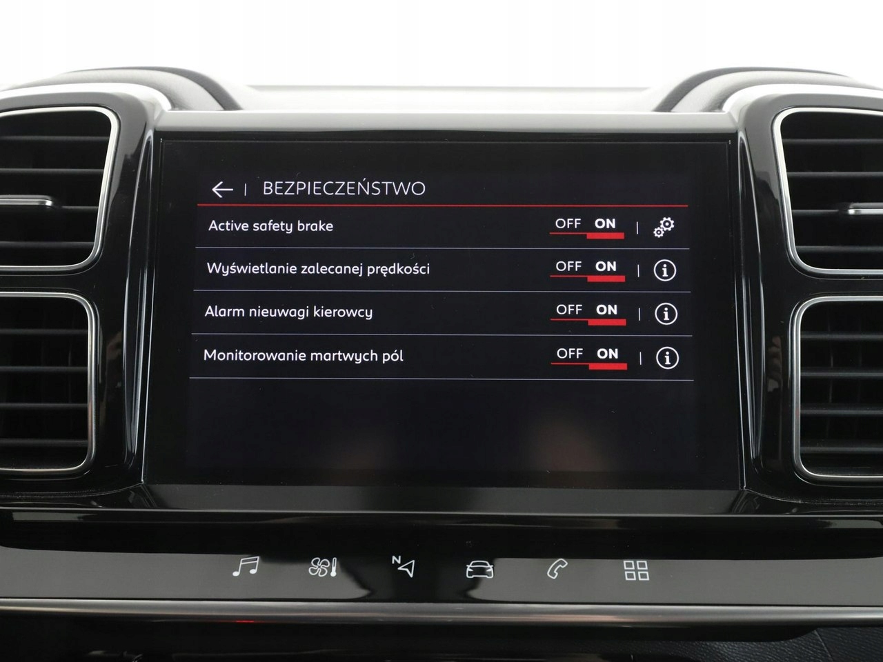 Czujnik deszczu, Czujniki parkowania tylne, Asystent pasa ruchu, Czujniki parkowania przednie, Poduszka powietrzna kierowcy, Poduszka powietrzna pasażera, Poduszki boczne przednie, Isofix, Kamera cofania, Elektryczne szyby przednie, Elektryczne szyby tylne, Elektrycznie ustawiane lusterka, Przyciemniane szyby, Wielofunkcyjna kierownica, Tapicerka skórzana, Gniazdo USB, Radio fabryczne, Nawigacja GPS, Centralny zamek, Tempomat, System Start-Stop