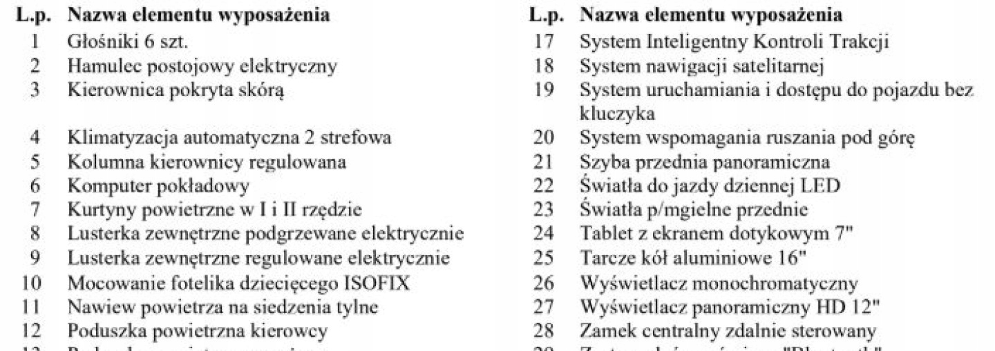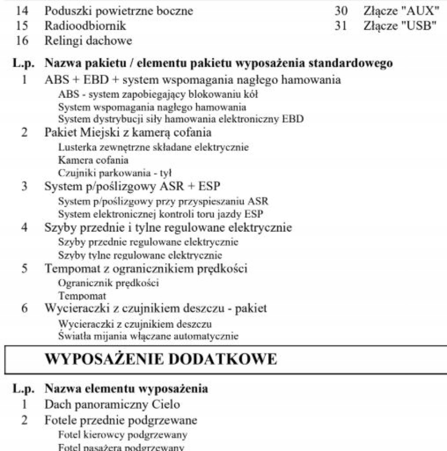 ABS, ASR (kontrola trakcji), Czujnik deszczu, Czujniki parkowania przednie, Czujniki parkowania tylne, Czujnik zmierzchu, ESP (stabilizacja toru jazdy), Isofix, Kamera cofania, Kurtyny powietrzne, Poduszka powietrzna kierowcy, Poduszka powietrzna pasażera, Poduszki boczne przednie, Światła xenonowe, Elektryczne szyby przednie, Elektryczne szyby tylne, Elektrycznie ustawiane lusterka, Podgrzewane lusterka boczne, Podgrzewane przednie siedzenia, Podgrzewane tylne siedzenia, Przyciemniane szyby, Tapicerka tekstylna, Wielofunkcyjna kierownica, Wspomaganie kierownicy, Skórzana kierownica, Bluetooth, Gniazdo USB, Nawigacja GPS, Radio fabryczne, Alufelgi, Elektrochromatyczne lusterka boczne, Łopatki zmiany biegów, Ogranicznik prędkości, Szyberdach, Tempomat