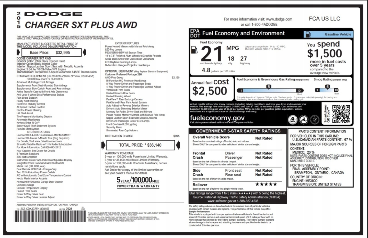 Dodge Charger Sxt Awd 2015 3.6 Benzyna 301KM