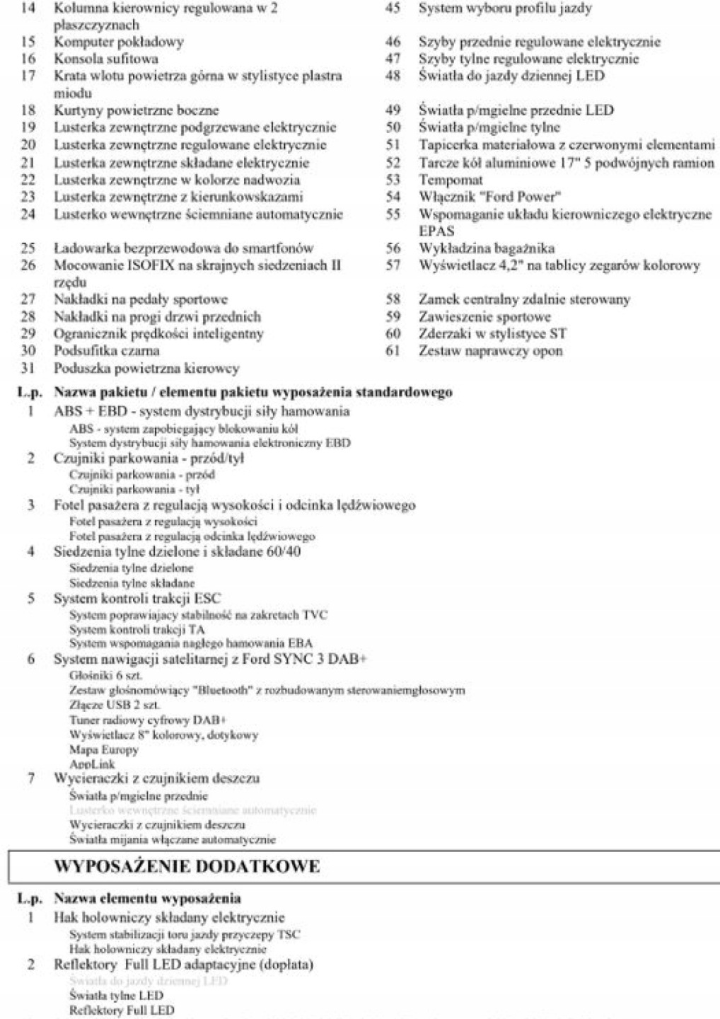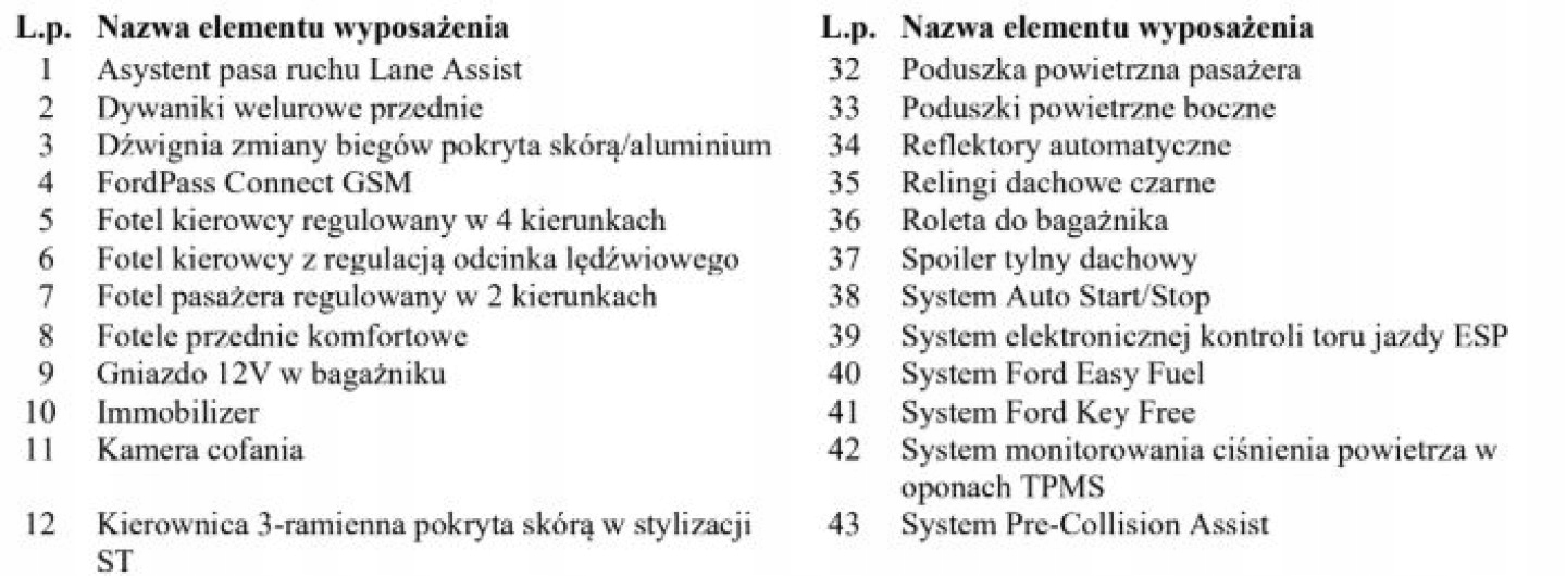 ABS, ASR (kontrola trakcji), Czujnik deszczu, Czujniki parkowania przednie, Czujniki parkowania tylne, Czujnik martwego pola, Czujnik zmierzchu, ESP (stabilizacja toru jazdy), Isofix, Kamera cofania, Kurtyny powietrzne, Poduszka powietrzna kierowcy, Poduszka powietrzna pasażera, Poduszki boczne przednie, Elektryczne szyby przednie, Elektryczne szyby tylne, Elektrycznie ustawiane lusterka, Podgrzewana przednia szyba, Podgrzewane lusterka boczne, Podgrzewane przednie siedzenia, Podgrzewane tylne siedzenia, Przyciemniane szyby, Wielofunkcyjna kierownica, Wspomaganie kierownicy, Skórzana kierownica, Bluetooth, Gniazdo USB, Nawigacja GPS, Radio fabryczne, Alufelgi, Bezkluczykowy dostęp, Łopatki zmiany biegów, Ogranicznik prędkości, System Start-Stop, Tempomat