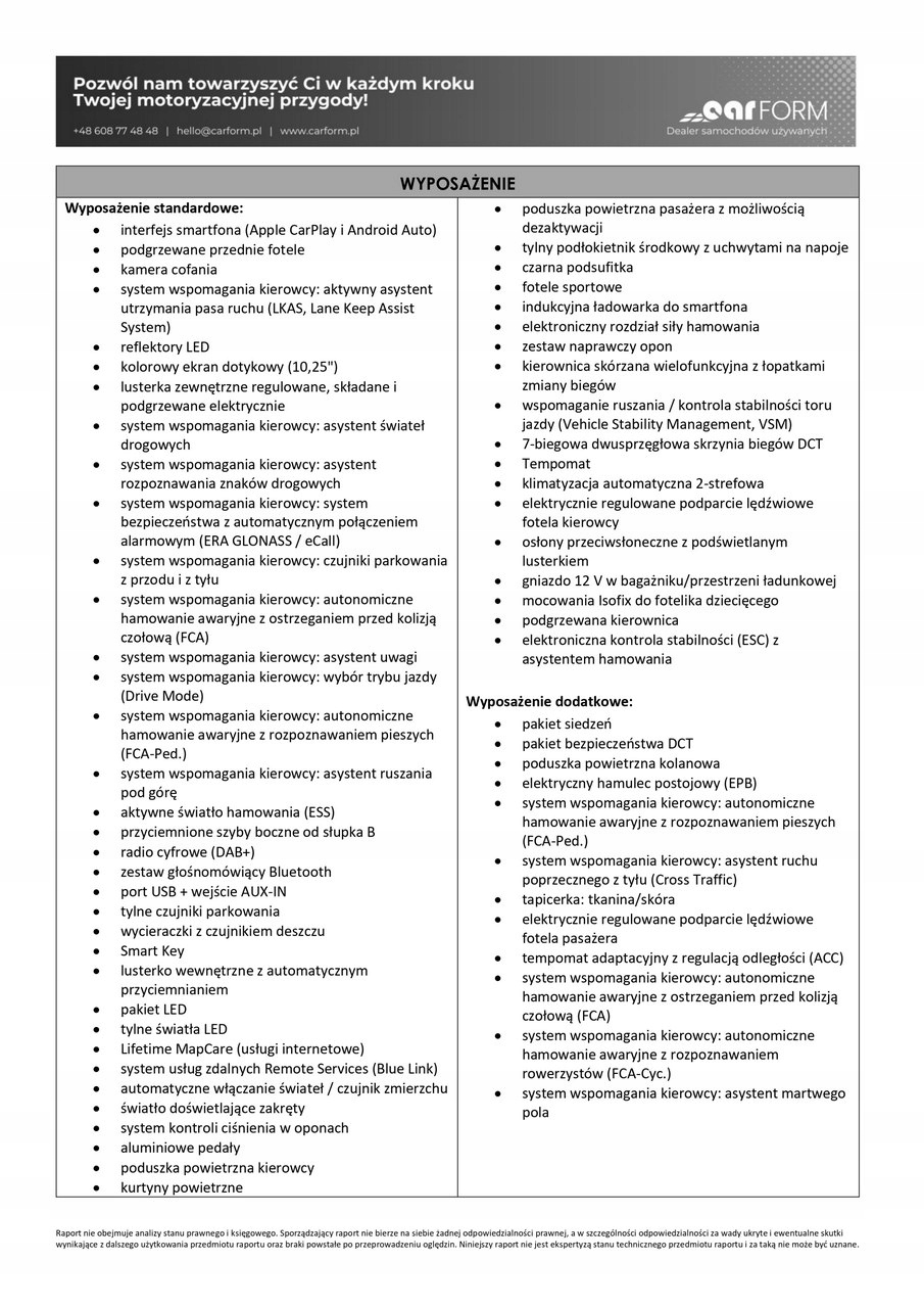 ABS, Alarm, ASR (kontrola trakcji), Czujnik deszczu, Czujniki parkowania tylne, Immobilizer, Asystent parkowania, Asystent pasa ruchu, Czujnik martwego pola, Czujniki parkowania przednie, Kurtyny powietrzne, Poduszki boczne przednie, Poduszka powietrzna chroniąca kolana, Poduszka powietrzna kierowcy, Poduszka powietrzna pasażera, ESP (stabilizacja toru jazdy), Isofix, Kamera cofania, Poduszki boczne tylne, Elektryczne szyby przednie, Elektryczne szyby tylne, Elektrycznie ustawiane lusterka, Podgrzewane przednie siedzenia, Przyciemniane szyby, Wielofunkcyjna kierownica, Wspomaganie kierownicy, Podgrzewane lusterka boczne, Tapicerka ciemna, Tapicerka alcantara, Bluetooth, Gniazdo AUX, Gniazdo USB, Radio fabryczne, Nawigacja GPS, Alufelgi, Bezkluczykowy dostęp, Centralny zamek, Komputer pokładowy, Relingi dachowe, Tempomat, Elektrochromatyczne lusterko wsteczne, System Start-Stop, Łopatki zmiany biegów, Tempomat aktywny
