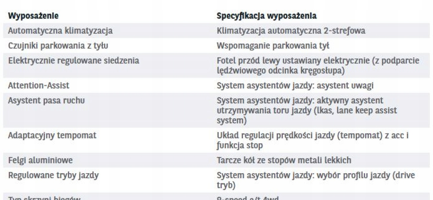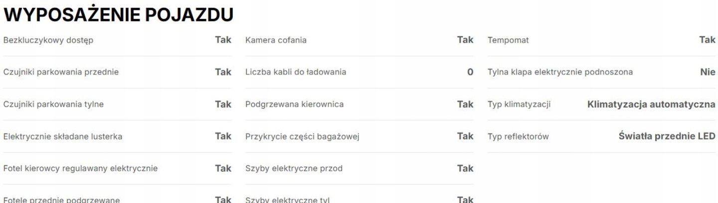 ASR (kontrola trakcji), Czujnik deszczu, Czujniki parkowania przednie, Czujniki parkowania tylne, Czujnik zmierzchu, ESP (stabilizacja toru jazdy), HUD (wyświetlacz przezierny), Isofix, Kamera cofania, Kurtyny powietrzne, Poduszka powietrzna kierowcy, Poduszka powietrzna pasażera, Poduszki boczne przednie, Elektryczne szyby przednie, Elektryczne szyby tylne, Elektrycznie ustawiane lusterka, Podgrzewana kierownica, Podgrzewane lusterka boczne, Podgrzewane przednie siedzenia, Podgrzewane tylne siedzenia, Przyciemniane szyby, Tapicerka tekstylna, Wielofunkcyjna kierownica, Wspomaganie kierownicy, Skórzana kierownica, Bluetooth, Gniazdo USB, Radio fabryczne, Alufelgi, Elektrochromatyczne lusterka boczne, Ogranicznik prędkości, System Start-Stop, Tempomat aktywny