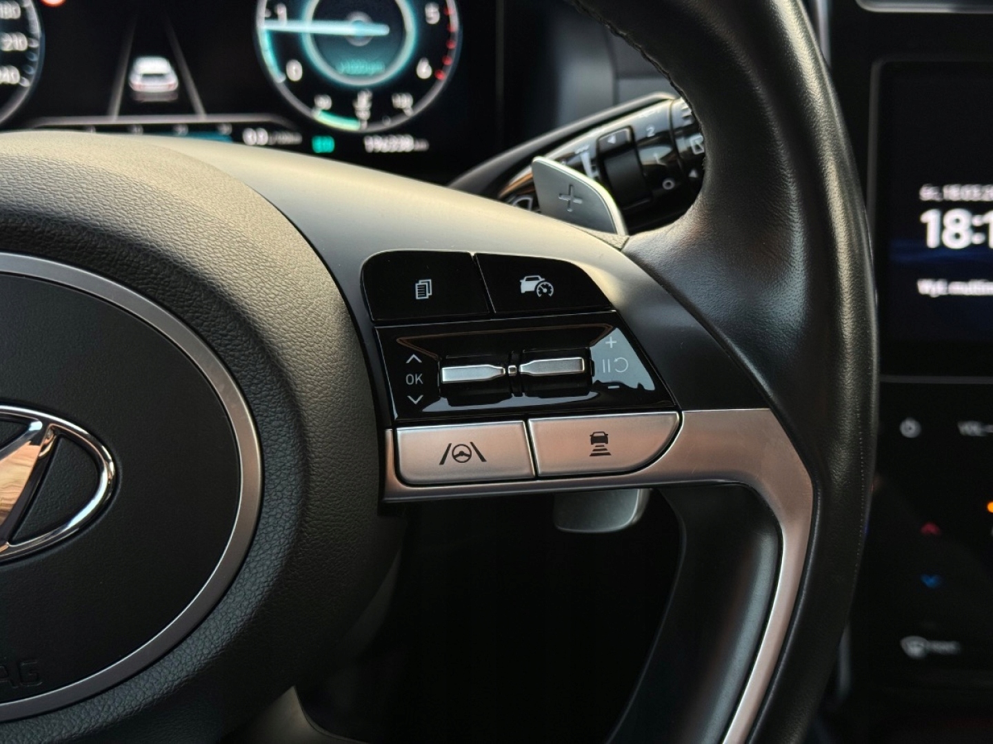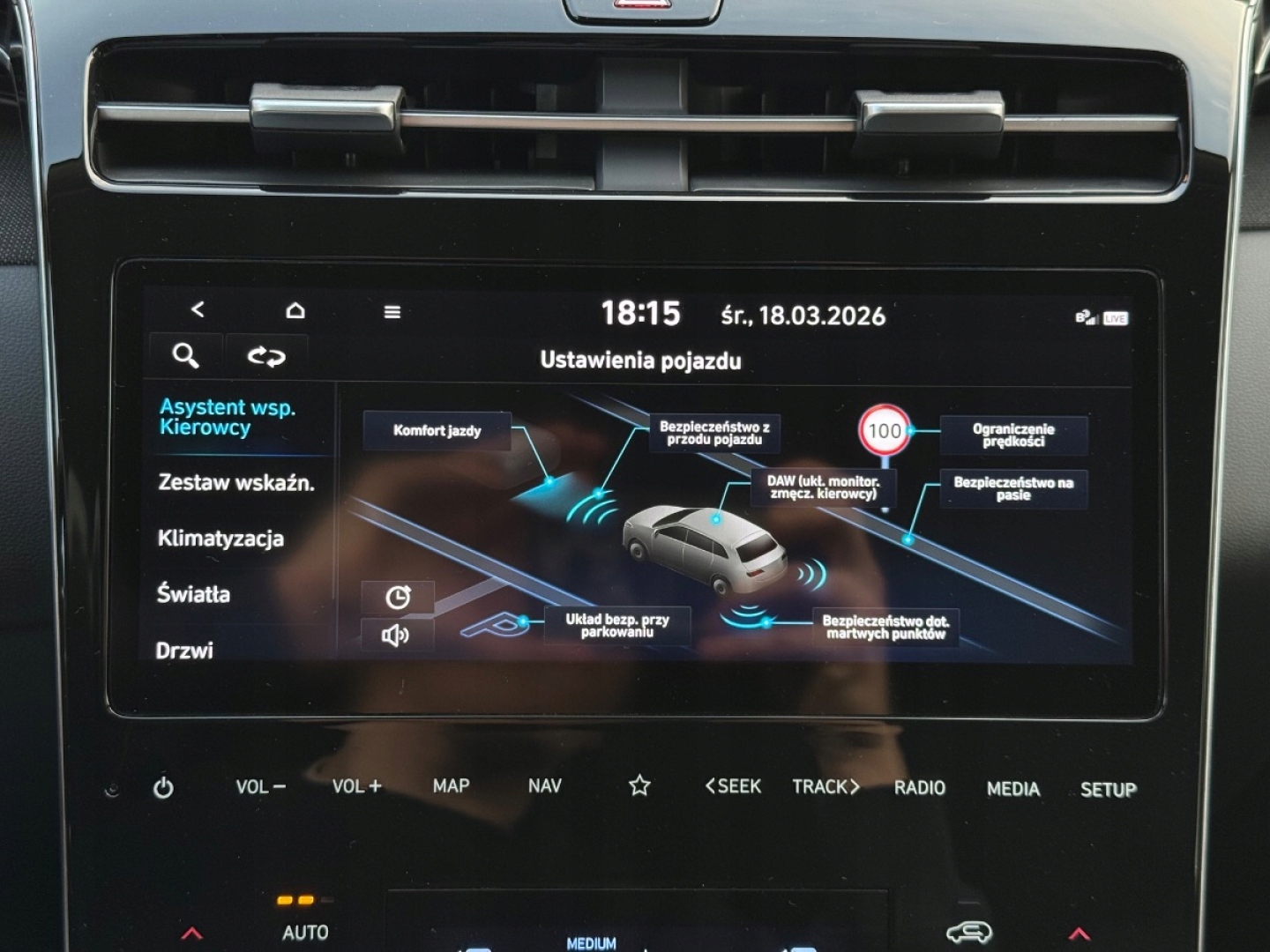 ABS, ASR (kontrola trakcji), Asystent pasa ruchu, Czujnik deszczu, Czujniki parkowania przednie, Czujniki parkowania tylne, Czujnik martwego pola, Czujnik zmierzchu, ESP (stabilizacja toru jazdy), Isofix, Kamera cofania, Kurtyny powietrzne, Poduszka powietrzna chroniąca kolana, Poduszka powietrzna kierowcy, Poduszka powietrzna pasażera, Poduszki boczne przednie, Poduszki boczne tylne, Elektryczne szyby przednie, Elektryczne szyby tylne, Elektrycznie ustawiane lusterka, Podgrzewana kierownica, Podgrzewane przednie siedzenia, Podgrzewane tylne siedzenia, Przyciemniane szyby, Tapicerka tekstylna, Wielofunkcyjna kierownica, Wspomaganie kierownicy, Skórzana kierownica, Bluetooth, Gniazdo USB, Nawigacja GPS, Radio fabryczne, Alufelgi, Bezkluczykowy dostęp, Łopatki zmiany biegów, Ogranicznik prędkości, System Start-Stop, Tempomat aktywny
