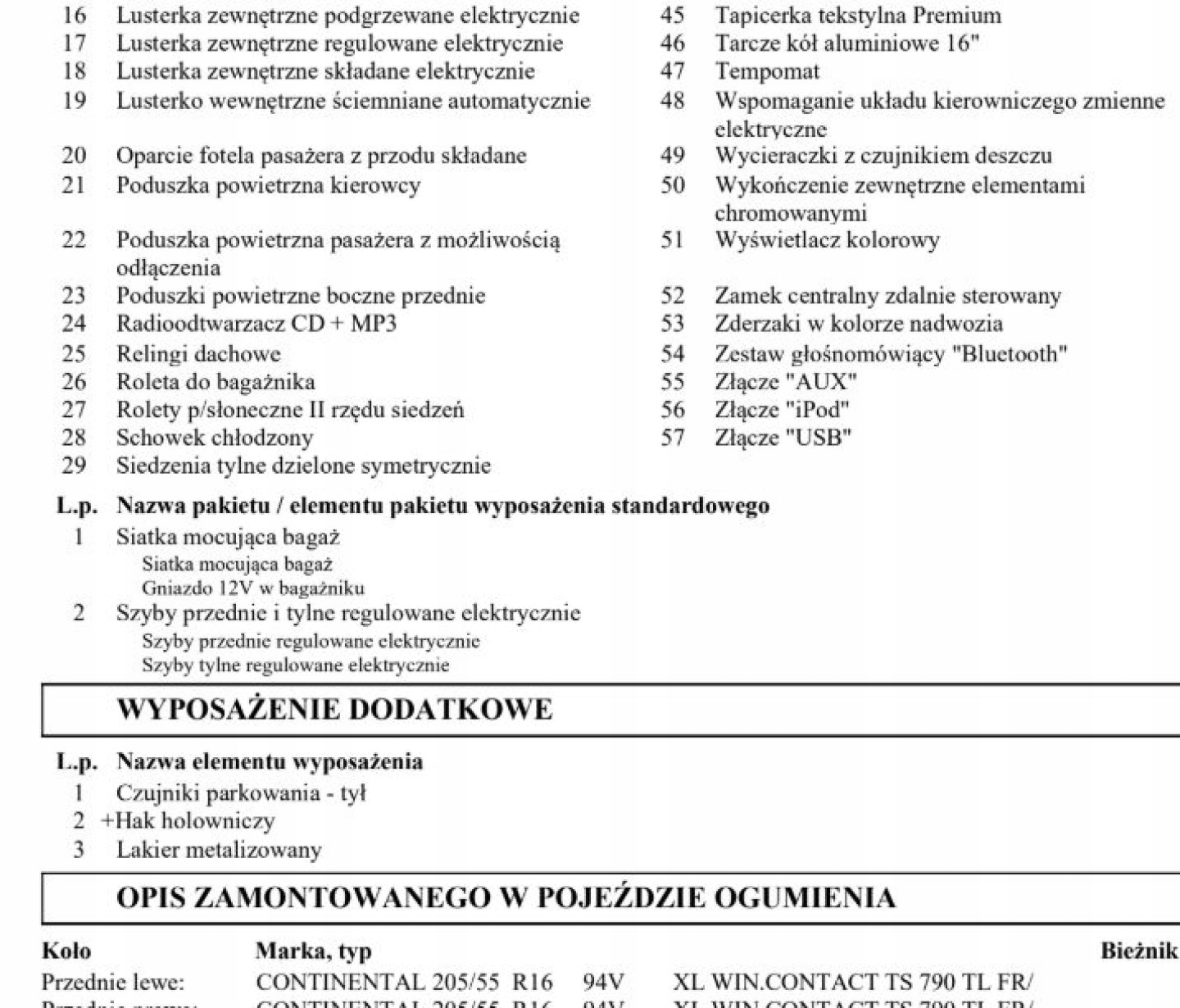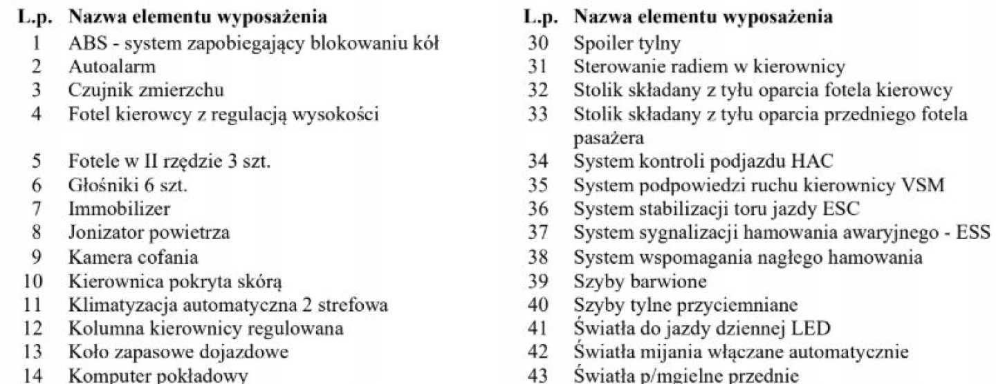 ABS, ASR (kontrola trakcji), Czujnik deszczu, Czujniki parkowania tylne, Czujnik zmierzchu, ESP (stabilizacja toru jazdy), Isofix, Kamera cofania, Kurtyny powietrzne, Poduszka powietrzna kierowcy, Poduszka powietrzna pasażera, Poduszki boczne przednie, Elektryczne szyby przednie, Elektryczne szyby tylne, Elektrycznie ustawiane lusterka, Podgrzewana kierownica, Podgrzewane lusterka boczne, Podgrzewane przednie siedzenia, Podgrzewane tylne siedzenia, Przyciemniane szyby, Tapicerka tekstylna, Wielofunkcyjna kierownica, Wspomaganie kierownicy, Skórzana kierownica, Bluetooth, Gniazdo USB, Nawigacja GPS, Radio fabryczne, Alufelgi, Elektrochromatyczne lusterka boczne, Ogranicznik prędkości, System Start-Stop, Tempomat