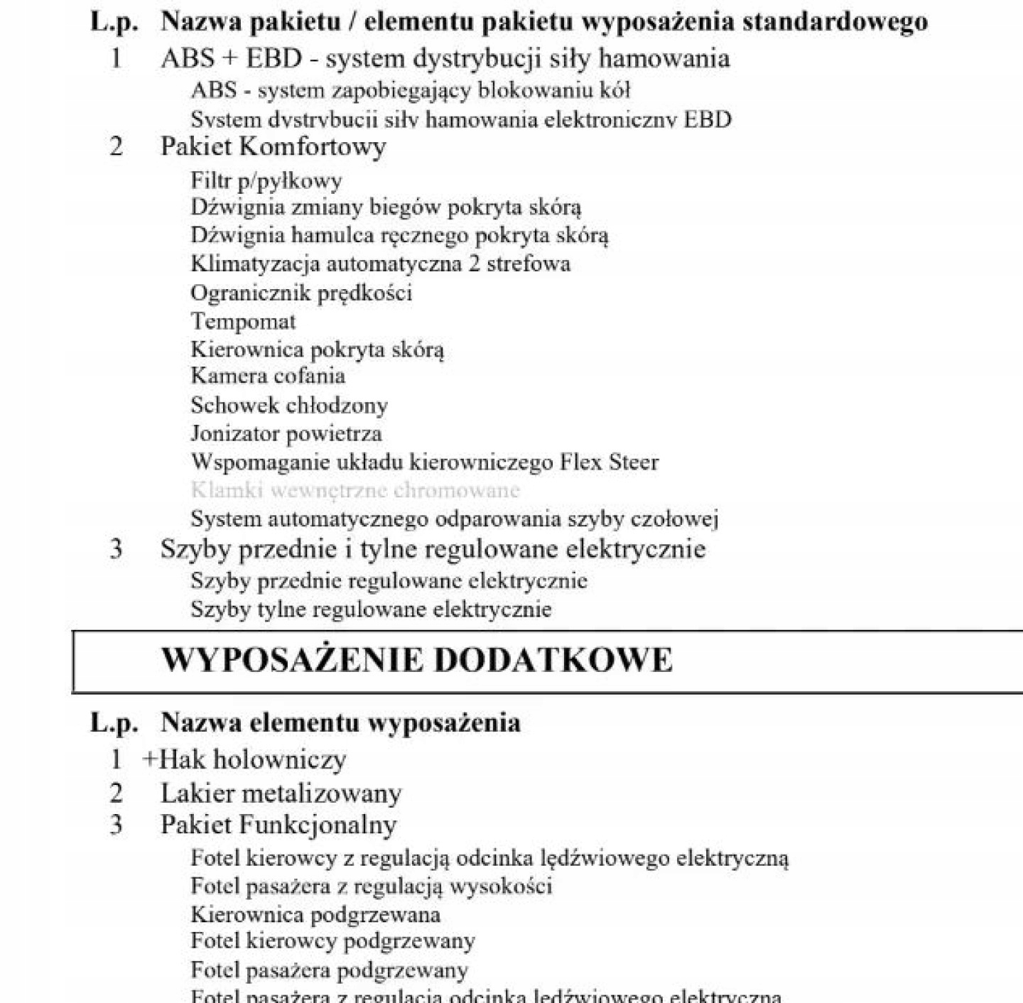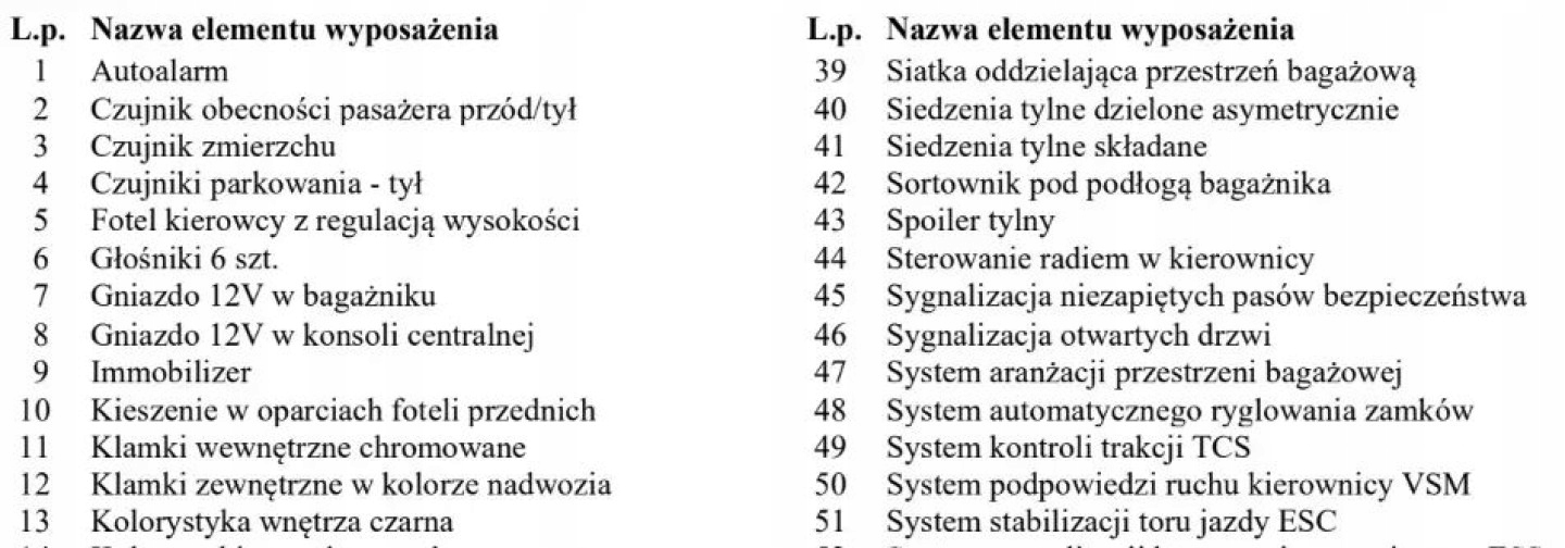 ABS, ASR (kontrola trakcji), Czujnik deszczu, Czujniki parkowania tylne, Czujnik zmierzchu, ESP (stabilizacja toru jazdy), Isofix, Kamera cofania, Kurtyny powietrzne, Poduszka powietrzna kierowcy, Poduszka powietrzna pasażera, Poduszki boczne przednie, Elektryczne szyby przednie, Elektryczne szyby tylne, Elektrycznie ustawiane lusterka, Podgrzewane lusterka boczne, Podgrzewane przednie siedzenia, Podgrzewane tylne siedzenia, Przyciemniane szyby, Tapicerka tekstylna, Wielofunkcyjna kierownica, Wspomaganie kierownicy, Skórzana kierownica, Bluetooth, Gniazdo USB, Nawigacja GPS, Radio fabryczne, Alufelgi, Elektrochromatyczne lusterka boczne, Ogranicznik prędkości, Tempomat