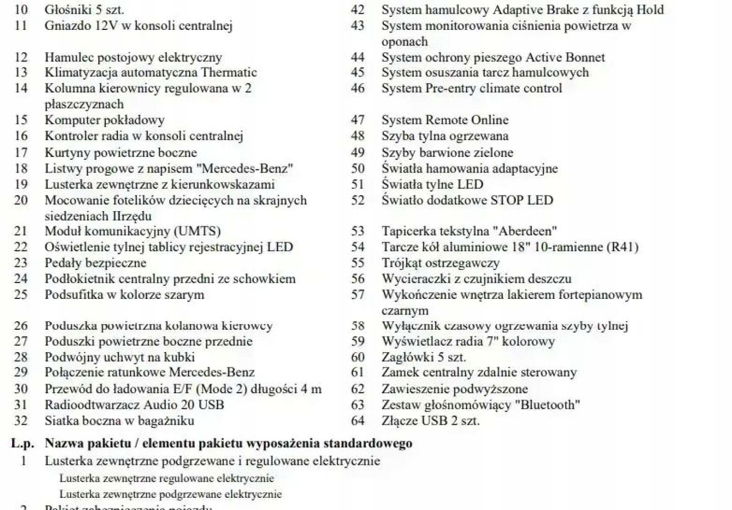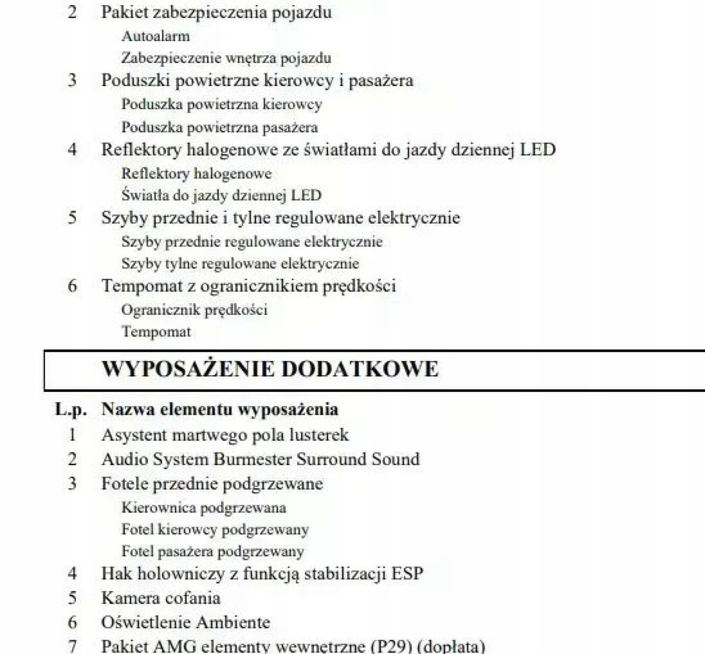 ABS, ASR (kontrola trakcji), Asystent parkowania, Czujnik deszczu, Czujniki parkowania przednie, Czujniki parkowania tylne, Czujnik zmierzchu, ESP (stabilizacja toru jazdy), Isofix, Kamera cofania, Kurtyny powietrzne, Poduszka powietrzna chroniąca kolana, Poduszka powietrzna kierowcy, Poduszka powietrzna pasażera, Poduszki boczne przednie, Elektryczne szyby przednie, Elektryczne szyby tylne, Elektrycznie ustawiane fotele, Elektrycznie ustawiane lusterka, Podgrzewane lusterka boczne, Podgrzewane przednie siedzenia, Podgrzewane tylne siedzenia, Przyciemniane szyby, Tapicerka skórzana, Wielofunkcyjna kierownica, Wspomaganie kierownicy, Skórzana kierownica, Bluetooth, Gniazdo USB, Nawigacja GPS, Radio fabryczne, Alufelgi, Bezkluczykowy dostęp, Elektrochromatyczne lusterka boczne, Łopatki zmiany biegów, Ogranicznik prędkości, System Start-Stop, Tempomat