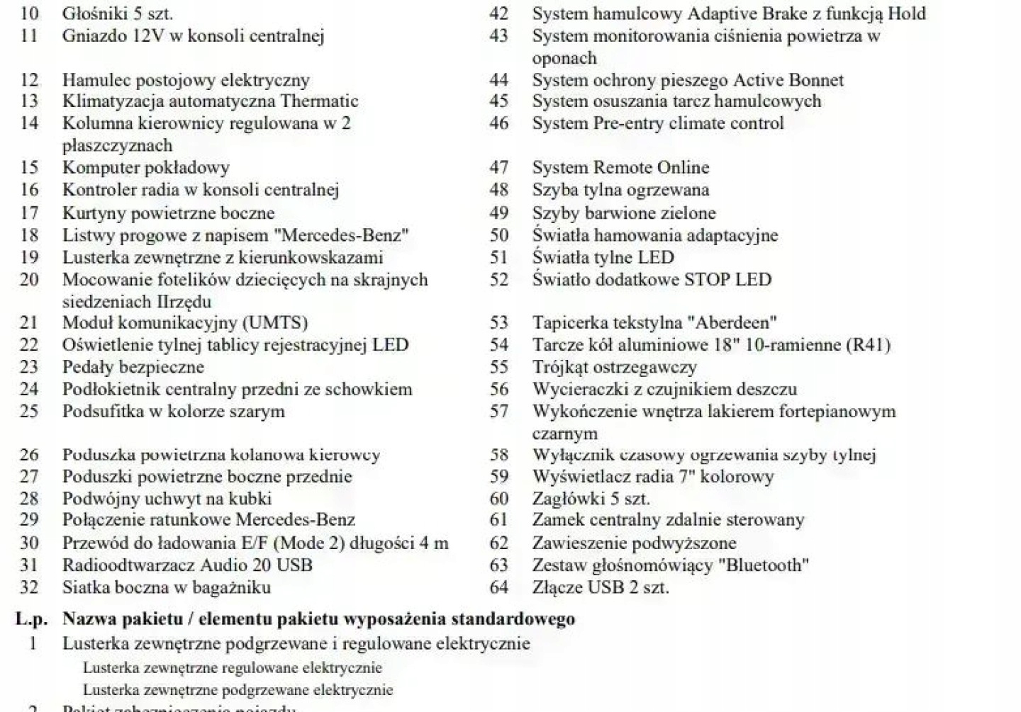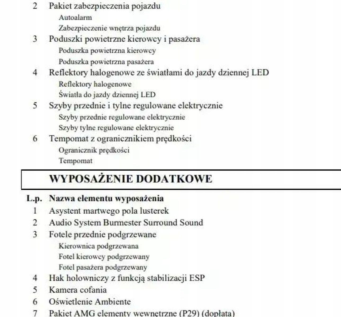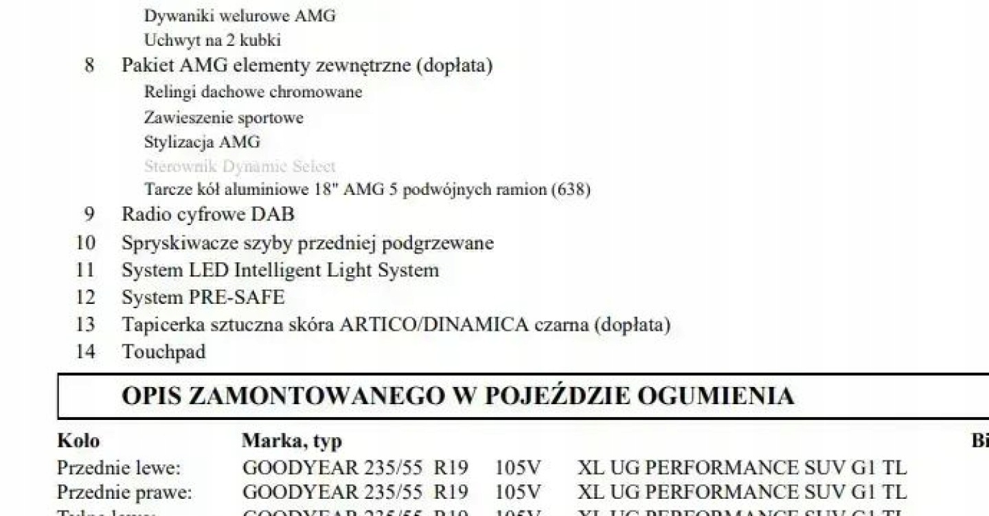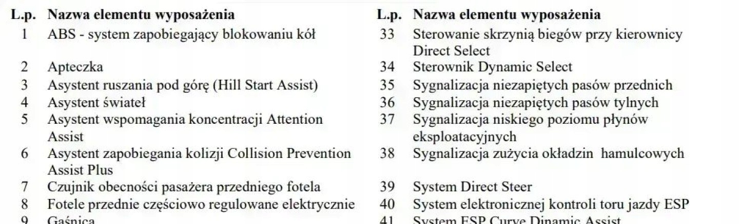 ABS, ASR (kontrola trakcji), Asystent parkowania, Czujnik deszczu, Czujniki parkowania przednie, Czujniki parkowania tylne, Czujnik zmierzchu, ESP (stabilizacja toru jazdy), Isofix, Kamera cofania, Kurtyny powietrzne, Poduszka powietrzna chroniąca kolana, Poduszka powietrzna kierowcy, Poduszka powietrzna pasażera, Poduszki boczne przednie, Elektryczne szyby przednie, Elektryczne szyby tylne, Elektrycznie ustawiane fotele, Elektrycznie ustawiane lusterka, Podgrzewane lusterka boczne, Podgrzewane przednie siedzenia, Podgrzewane tylne siedzenia, Przyciemniane szyby, Tapicerka skórzana, Wielofunkcyjna kierownica, Wspomaganie kierownicy, Skórzana kierownica, Bluetooth, Gniazdo USB, Nawigacja GPS, Radio fabryczne, Alufelgi, Bezkluczykowy dostęp, Elektrochromatyczne lusterka boczne, Łopatki zmiany biegów, Ogranicznik prędkości, System Start-Stop, Tempomat