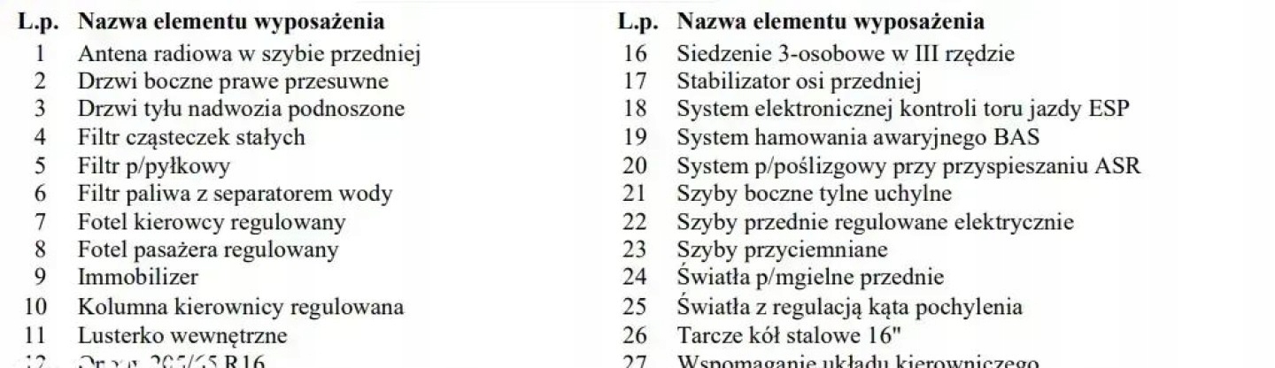 ABS, ASR (kontrola trakcji), Asystent parkowania, Czujnik deszczu, Czujniki parkowania przednie, Czujniki parkowania tylne, Czujnik zmierzchu, ESP (stabilizacja toru jazdy), Kurtyny powietrzne, Poduszka powietrzna kierowcy, Poduszka powietrzna pasażera, Poduszki boczne przednie, Elektryczne szyby przednie, Podgrzewane lusterka boczne, Podgrzewane przednie siedzenia, Podgrzewane tylne siedzenia, Tapicerka tekstylna, Wielofunkcyjna kierownica, Wspomaganie kierownicy, Bluetooth, Radio fabryczne, Alufelgi, System Start-Stop, Tempomat