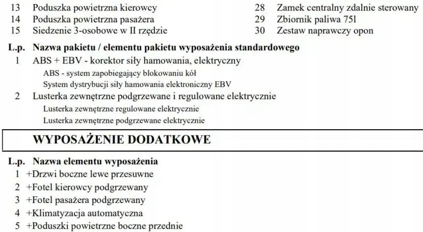 ABS, ASR (kontrola trakcji), Asystent parkowania, Czujnik deszczu, Czujniki parkowania przednie, Czujniki parkowania tylne, Czujnik zmierzchu, ESP (stabilizacja toru jazdy), Kurtyny powietrzne, Poduszka powietrzna kierowcy, Poduszka powietrzna pasażera, Poduszki boczne przednie, Elektryczne szyby przednie, Podgrzewane lusterka boczne, Podgrzewane przednie siedzenia, Podgrzewane tylne siedzenia, Tapicerka tekstylna, Wielofunkcyjna kierownica, Wspomaganie kierownicy, Bluetooth, Gniazdo USB, Radio fabryczne, Alufelgi, System Start-Stop, Tempomat