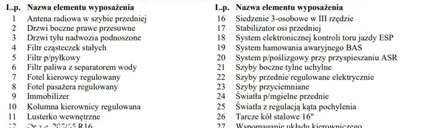 ABS, ASR (kontrola trakcji), Asystent parkowania, Czujnik deszczu, Czujniki parkowania przednie, Czujniki parkowania tylne, Czujnik zmierzchu, ESP (stabilizacja toru jazdy), Kurtyny powietrzne, Poduszka powietrzna kierowcy, Poduszka powietrzna pasażera, Poduszki boczne przednie, Elektryczne szyby przednie, Podgrzewane lusterka boczne, Podgrzewane przednie siedzenia, Podgrzewane tylne siedzenia, Tapicerka tekstylna, Wielofunkcyjna kierownica, Wspomaganie kierownicy, Bluetooth, Gniazdo USB, Radio fabryczne, Alufelgi, System Start-Stop, Tempomat
