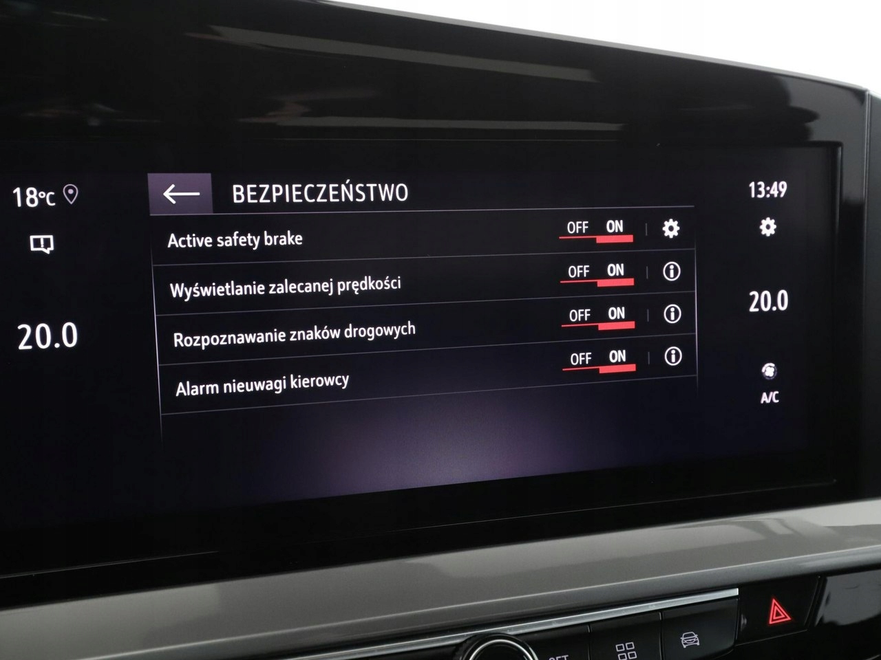 ABS, ASR (kontrola trakcji), Czujnik deszczu, Asystent pasa ruchu, Czujnik martwego pola, Poduszka powietrzna kierowcy, Poduszka powietrzna pasażera, Poduszki boczne przednie, ESP (stabilizacja toru jazdy), Isofix, Kamera cofania, Elektryczne szyby przednie, Elektryczne szyby tylne, Elektrycznie ustawiane lusterka, Podgrzewane przednie siedzenia, Przyciemniane szyby, Wielofunkcyjna kierownica, Wspomaganie kierownicy, Tapicerka alcantara, Bluetooth, Radio fabryczne, Nawigacja GPS, Centralny zamek, Tempomat, Elektrochromatyczne lusterko wsteczne, System Start-Stop, Łopatki zmiany biegów, Tempomat aktywny