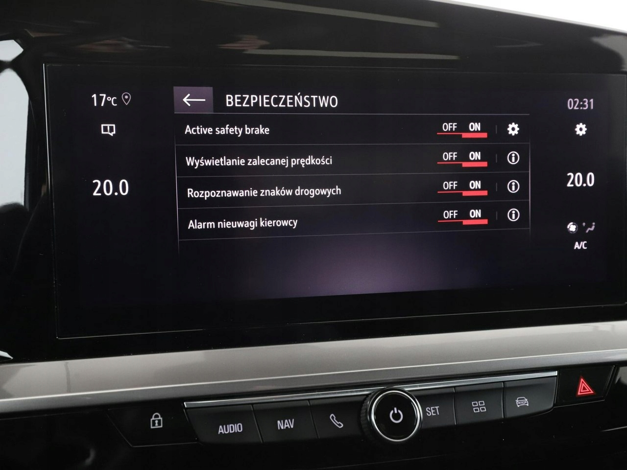 ABS, ASR (kontrola trakcji), Czujnik deszczu, Czujniki parkowania tylne, Immobilizer, Asystent pasa ruchu, Czujnik martwego pola, Czujniki parkowania przednie, Poduszka powietrzna kierowcy, Poduszka powietrzna pasażera, Poduszki boczne przednie, ESP (stabilizacja toru jazdy), Isofix, Kamera cofania, Elektryczne szyby przednie, Elektryczne szyby tylne, Elektrycznie ustawiane lusterka, Podgrzewane przednie siedzenia, Wielofunkcyjna kierownica, Wspomaganie kierownicy, Tapicerka tekstylna, Gniazdo USB, Radio fabryczne, Nawigacja GPS, Centralny zamek, Komputer pokładowy, Tempomat, System Start-Stop, Łopatki zmiany biegów, Tempomat aktywny