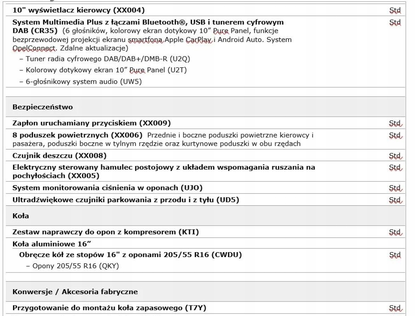 ABS, ASR (kontrola trakcji), Czujnik deszczu, Czujniki parkowania przednie, Czujniki parkowania tylne, Czujnik zmierzchu, ESP (stabilizacja toru jazdy), Kamera cofania, Kurtyny powietrzne, Poduszka powietrzna kierowcy, Poduszka powietrzna pasażera, Poduszki boczne przednie, Poduszki boczne tylne, Elektryczne szyby przednie, Elektryczne szyby tylne, Elektrycznie ustawiane lusterka, Podgrzewana kierownica, Podgrzewane lusterka boczne, Podgrzewane przednie siedzenia, Podgrzewane tylne siedzenia, Przyciemniane szyby, Tapicerka tekstylna, Wielofunkcyjna kierownica, Skórzana kierownica, Bluetooth, Gniazdo USB, Radio fabryczne, Alufelgi, Bezkluczykowy dostęp, Elektrochromatyczne lusterka boczne, System Start-Stop, Tempomat
