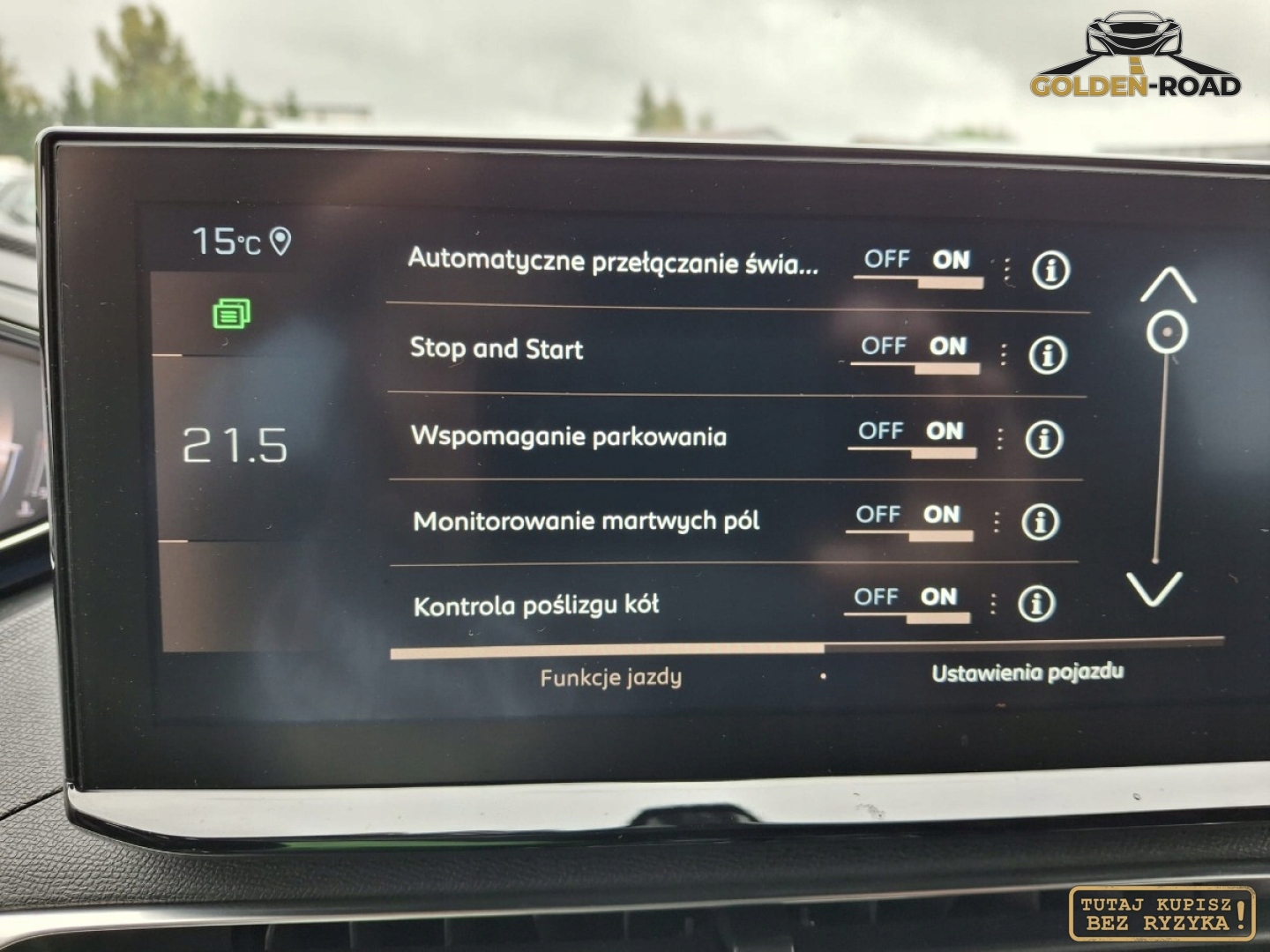 ABS, ASR (kontrola trakcji), Asystent parkowania, Czujnik deszczu, Czujniki parkowania przednie, Czujniki parkowania tylne, Czujnik zmierzchu, ESP (stabilizacja toru jazdy), Kamera cofania, Kurtyny powietrzne, Poduszka powietrzna chroniąca kolana, Poduszka powietrzna kierowcy, Poduszka powietrzna pasażera, Poduszki boczne przednie, Elektryczne szyby przednie, Elektryczne szyby tylne, Elektrycznie ustawiane lusterka, Podgrzewane lusterka boczne, Przyciemniane szyby, Tapicerka alcantara, Wielofunkcyjna kierownica, Wspomaganie kierownicy, Skórzana kierownica, Bluetooth, Gniazdo USB, Nawigacja GPS, Radio fabryczne, Alufelgi, Elektrochromatyczne lusterka boczne, System Start-Stop, Tempomat