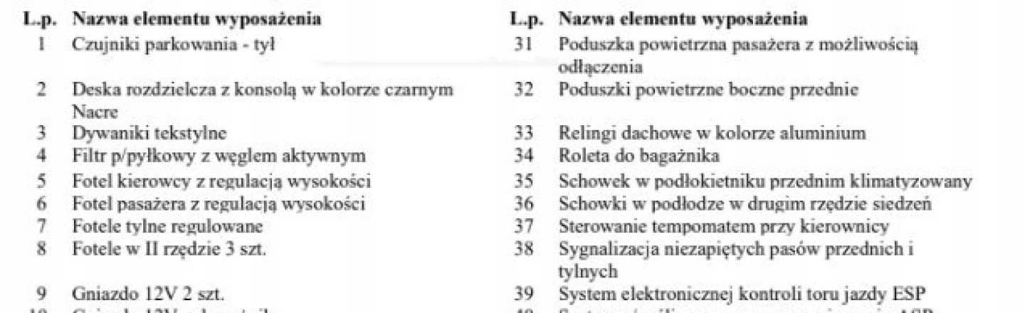ABS, ASR (kontrola trakcji), Czujnik deszczu, Czujniki parkowania tylne, Czujnik zmierzchu, ESP (stabilizacja toru jazdy), Isofix, Kamera cofania, Kurtyny powietrzne, Poduszka powietrzna kierowcy, Poduszka powietrzna pasażera, Poduszki boczne przednie, Elektryczne szyby przednie, Elektryczne szyby tylne, Elektrycznie ustawiane lusterka, Podgrzewane lusterka boczne, Podgrzewane przednie siedzenia, Podgrzewane tylne siedzenia, Tapicerka tekstylna, Wielofunkcyjna kierownica, Wspomaganie kierownicy, Skórzana kierownica, Bluetooth, Gniazdo USB, Nawigacja GPS, Radio fabryczne, Alufelgi, Elektrochromatyczne lusterka boczne, Ogranicznik prędkości, Szyberdach, Tempomat