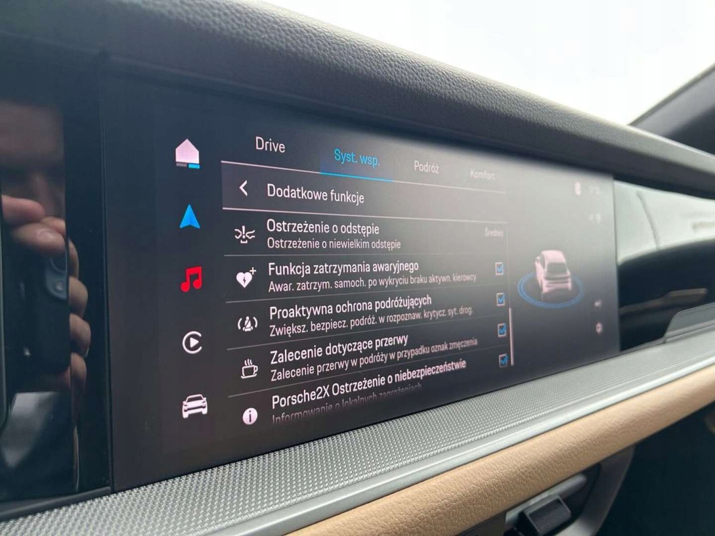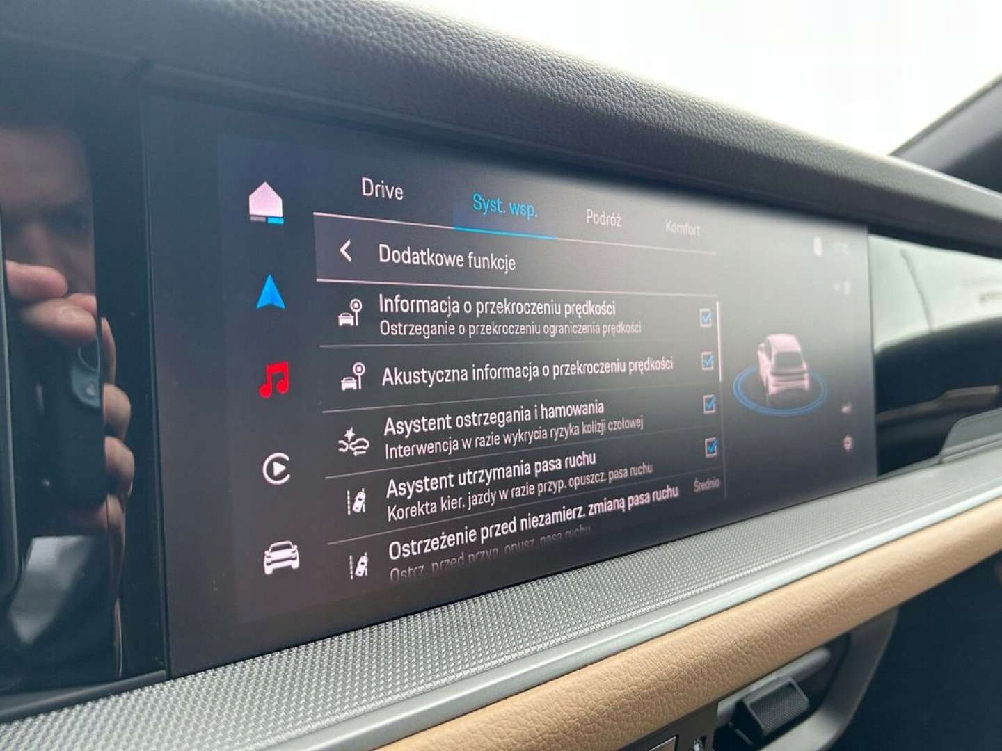 ABS, Asystent parkowania, Czujnik deszczu, Czujnik zmierzchu, ESP (stabilizacja toru jazdy), Isofix, Kamera cofania, Poduszka powietrzna kierowcy, Poduszka powietrzna pasażera, Poduszki boczne przednie, Elektryczne szyby przednie, Elektryczne szyby tylne, Podgrzewane lusterka boczne, Podgrzewane przednie siedzenia, Podgrzewane tylne siedzenia, Tapicerka skórzana, Wielofunkcyjna kierownica, Zawieszenie adaptacyjne, Skórzana kierownica, Bluetooth, Alufelgi, System Start-Stop, Tempomat