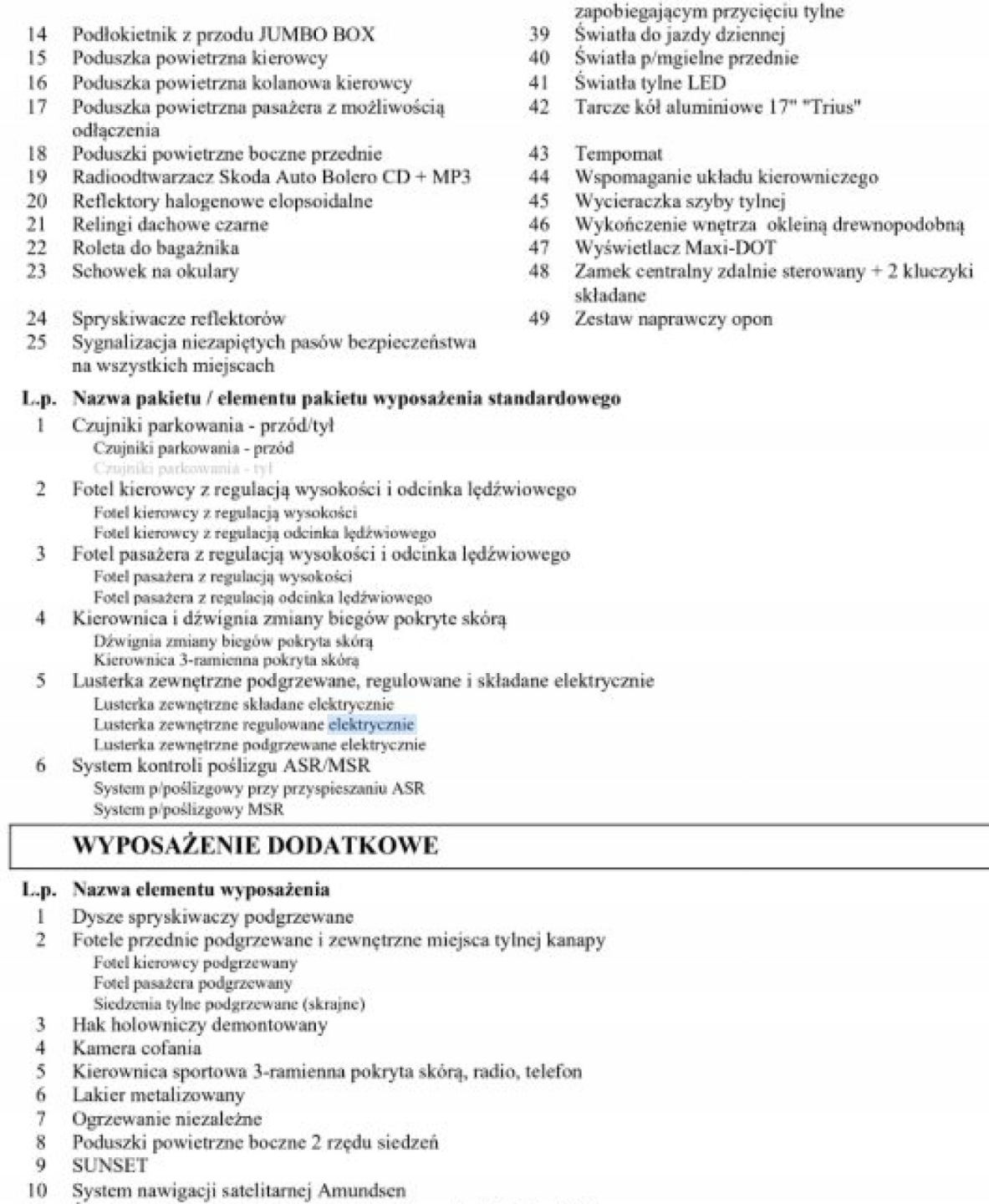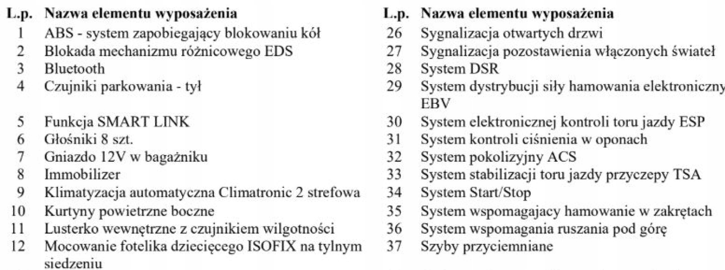 ABS, ASR (kontrola trakcji), Czujnik deszczu, Czujniki parkowania tylne, Czujnik zmierzchu, ESP (stabilizacja toru jazdy), Isofix, Kamera cofania, Kurtyny powietrzne, Poduszka powietrzna chroniąca kolana, Poduszka powietrzna kierowcy, Poduszka powietrzna pasażera, Poduszki boczne przednie, Elektryczne szyby przednie, Elektryczne szyby tylne, Elektrycznie ustawiane lusterka, Ogrzewanie postojowe, Podgrzewane lusterka boczne, Podgrzewane przednie siedzenia, Podgrzewane tylne siedzenia, Wielofunkcyjna kierownica, Wspomaganie kierownicy, Skórzana kierownica, Bluetooth, Gniazdo USB, Nawigacja GPS, Radio fabryczne, Alufelgi, Łopatki zmiany biegów, System Start-Stop, Tempomat aktywny