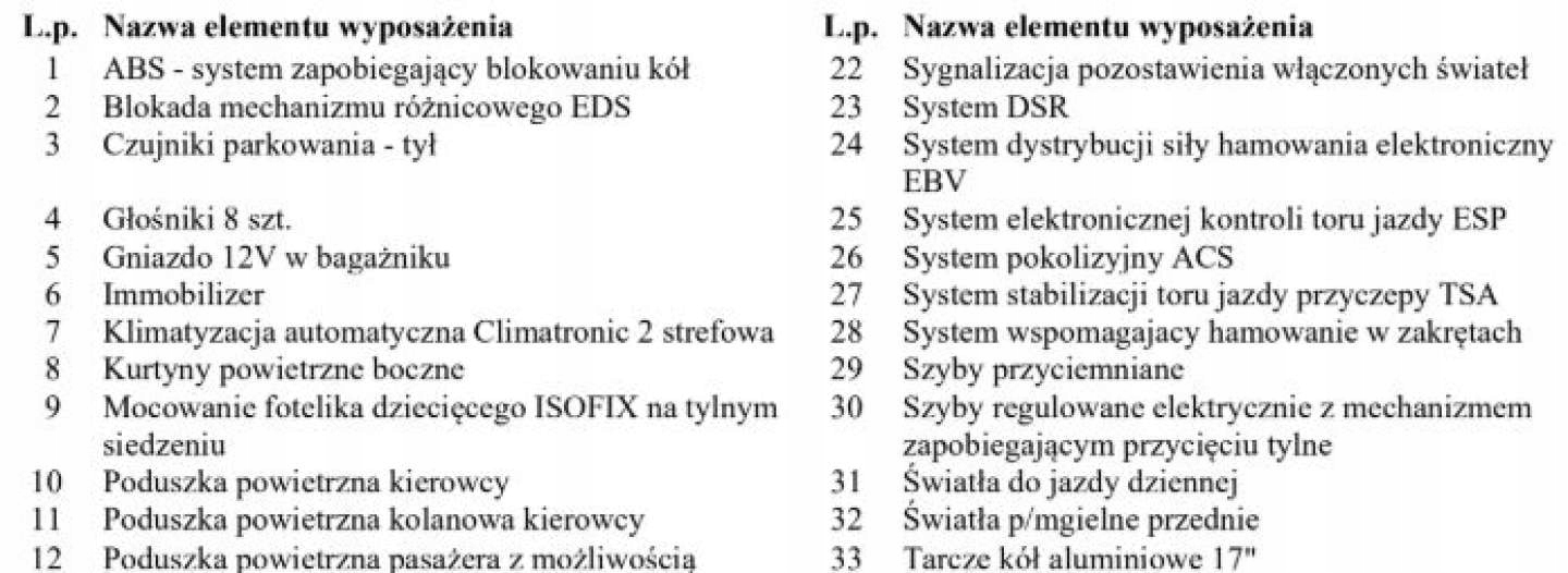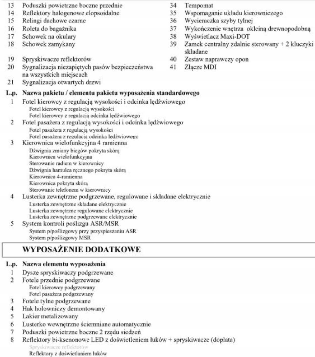 ABS, ASR (kontrola trakcji), Czujnik deszczu, Czujniki parkowania tylne, Czujnik zmierzchu, ESP (stabilizacja toru jazdy), Isofix, Kurtyny powietrzne, Poduszka powietrzna chroniąca kolana, Poduszka powietrzna kierowcy, Poduszka powietrzna pasażera, Poduszki boczne przednie, Elektryczne szyby przednie, Elektryczne szyby tylne, Elektrycznie ustawiane lusterka, Podgrzewane lusterka boczne, Podgrzewane przednie siedzenia, Podgrzewane tylne siedzenia, Wielofunkcyjna kierownica, Wspomaganie kierownicy, Skórzana kierownica, Bluetooth, Gniazdo USB, Radio fabryczne, Alufelgi, Elektrochromatyczne lusterka boczne, Ogranicznik prędkości, System Start-Stop, Tempomat
