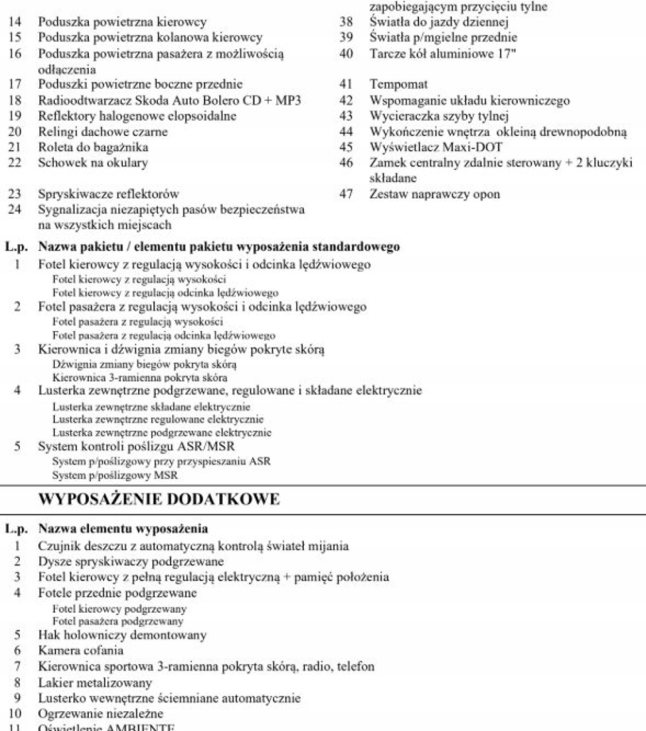 ABS, ASR (kontrola trakcji), Czujnik deszczu, Czujniki parkowania tylne, Czujnik zmierzchu, ESP (stabilizacja toru jazdy), Isofix, Kamera cofania, Kurtyny powietrzne, Poduszka powietrzna chroniąca kolana, Poduszka powietrzna kierowcy, Poduszka powietrzna pasażera, Poduszki boczne przednie, Elektryczne szyby przednie, Elektryczne szyby tylne, Elektrycznie ustawiane lusterka, Ogrzewanie postojowe, Podgrzewane lusterka boczne, Podgrzewane przednie siedzenia, Podgrzewane tylne siedzenia, Tapicerka tekstylna, Wielofunkcyjna kierownica, Wspomaganie kierownicy, Skórzana kierownica, Bluetooth, Gniazdo USB, Radio fabryczne, Alufelgi, Elektrochromatyczne lusterka boczne, Łopatki zmiany biegów, Ogranicznik prędkości, System Start-Stop, Tempomat
