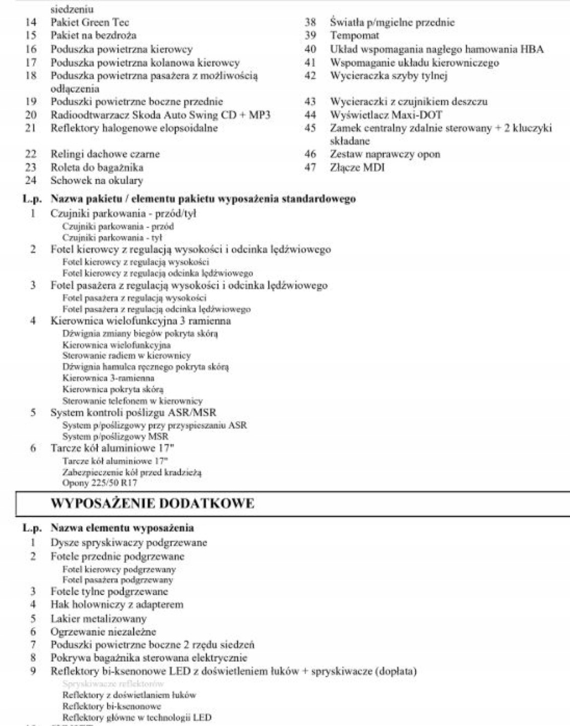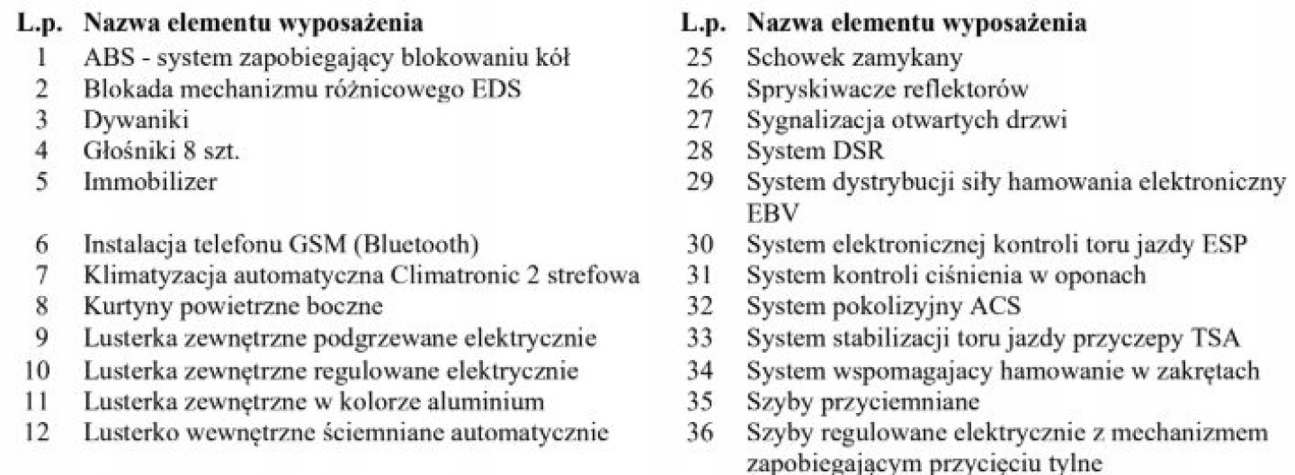 ABS, ASR (kontrola trakcji), Czujnik deszczu, Czujniki parkowania tylne, Czujnik martwego pola, Czujnik zmierzchu, ESP (stabilizacja toru jazdy), Isofix, Kamera cofania, Kurtyny powietrzne, Poduszka powietrzna chroniąca kolana, Poduszka powietrzna kierowcy, Poduszka powietrzna pasażera, Poduszki boczne przednie, Elektryczne szyby przednie, Elektryczne szyby tylne, Elektrycznie ustawiane lusterka, Ogrzewanie postojowe, Podgrzewana kierownica, Podgrzewane lusterka boczne, Podgrzewane przednie siedzenia, Podgrzewane tylne siedzenia, Przyciemniane szyby, Tapicerka skórzana, Wielofunkcyjna kierownica, Wspomaganie kierownicy, Skórzana kierownica, Bluetooth, Gniazdo USB, Radio fabryczne, Alufelgi, Elektrochromatyczne lusterka boczne, Ogranicznik prędkości, System Start-Stop, Tempomat
