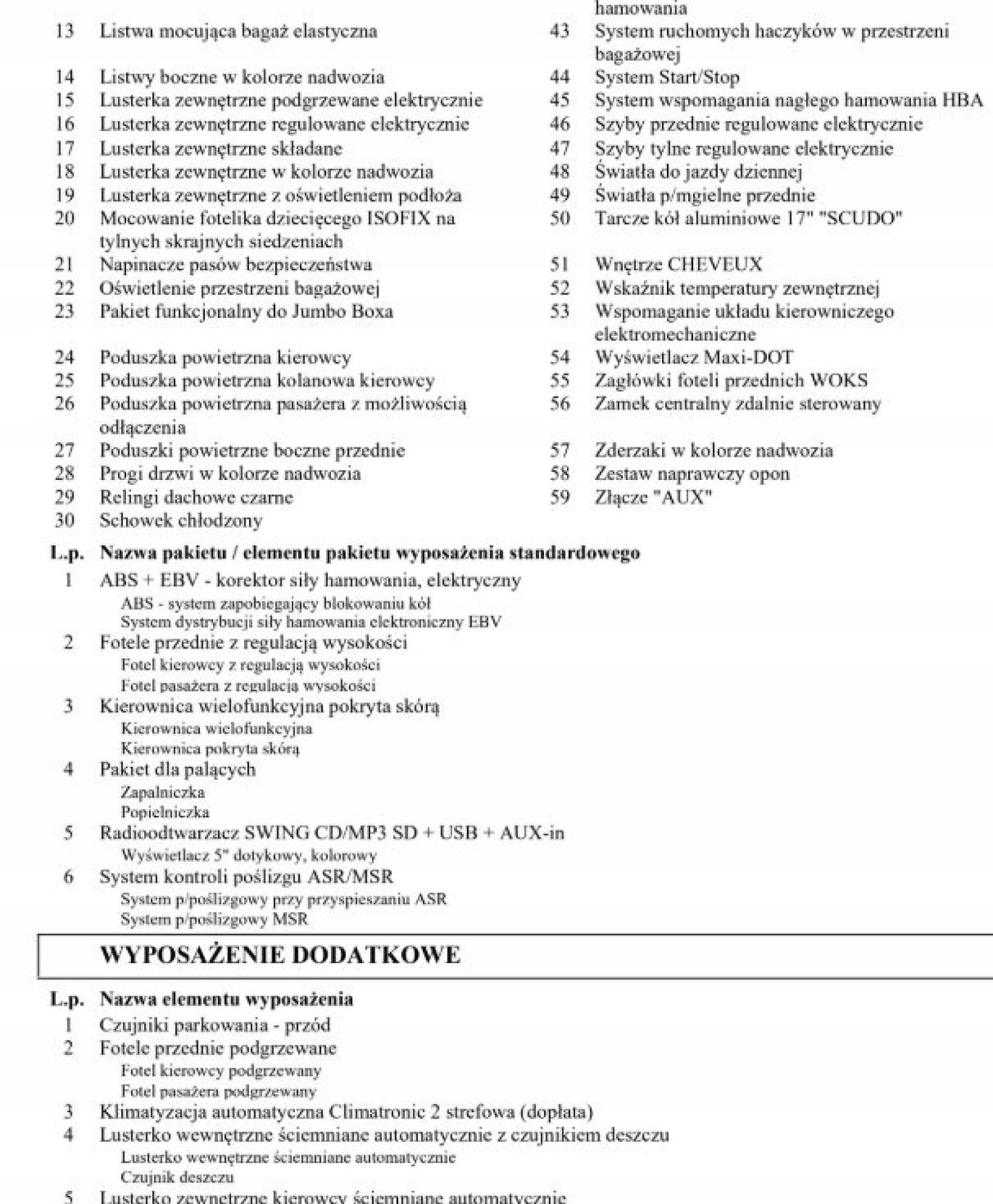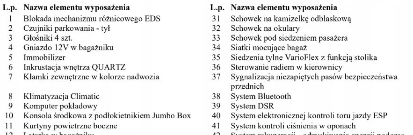 ABS, ASR (kontrola trakcji), Czujniki parkowania przednie, Czujniki parkowania tylne, Czujnik zmierzchu, ESP (stabilizacja toru jazdy), Isofix, Kurtyny powietrzne, Poduszka powietrzna chroniąca kolana, Poduszka powietrzna kierowcy, Poduszka powietrzna pasażera, Poduszki boczne przednie, Elektryczne szyby przednie, Elektryczne szyby tylne, Elektrycznie ustawiane lusterka, Ogrzewanie postojowe, Podgrzewane lusterka boczne, Podgrzewane przednie siedzenia, Podgrzewane tylne siedzenia, Tapicerka tekstylna, Wspomaganie kierownicy, Skórzana kierownica, Bluetooth, Gniazdo USB, Radio fabryczne, Alufelgi, Elektrochromatyczne lusterka boczne, Ogranicznik prędkości, System Start-Stop, Tempomat