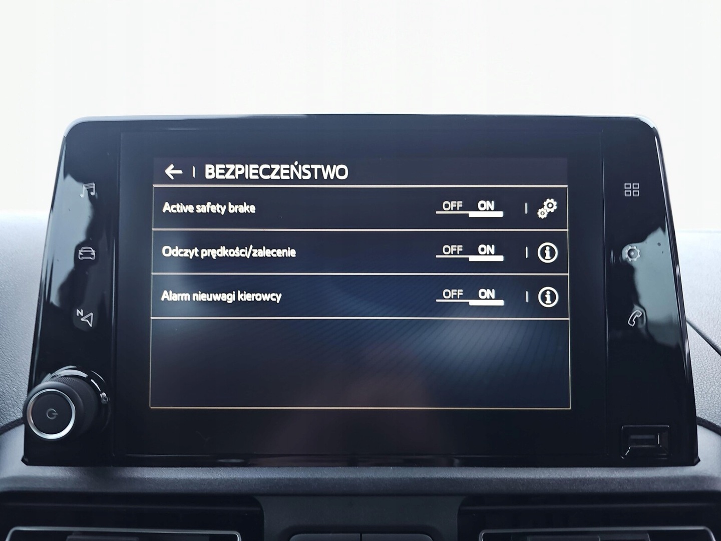Asystent pasa ruchu, Poduszki boczne przednie, Poduszki boczne tylne, Czujnik zmierzchu, ESP (stabilizacja toru jazdy), Isofix, Poduszka powietrzna kierowcy, Poduszka powietrzna pasażera, Elektrycznie ustawiane lusterka, Podgrzewane lusterka boczne, Bluetooth, Ogranicznik prędkości, Tempomat