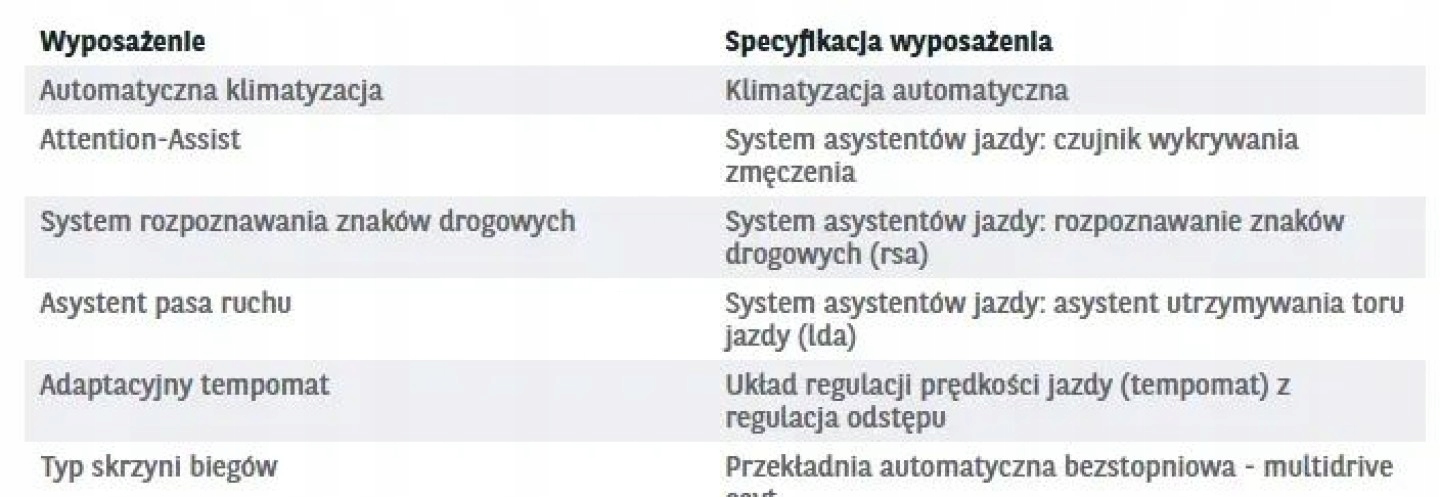 ABS, ASR (kontrola trakcji), Czujnik deszczu, Czujnik zmierzchu, ESP (stabilizacja toru jazdy), Isofix, Kurtyny powietrzne, Poduszka powietrzna kierowcy, Poduszka powietrzna pasażera, Poduszki boczne przednie, Elektryczne szyby przednie, Elektryczne szyby tylne, Elektrycznie ustawiane lusterka, Podgrzewane lusterka boczne, Tapicerka tekstylna, Wielofunkcyjna kierownica, Wspomaganie kierownicy, Bluetooth, Gniazdo USB, Radio fabryczne, Alufelgi, Elektrochromatyczne lusterka boczne, Ogranicznik prędkości, Tempomat aktywny