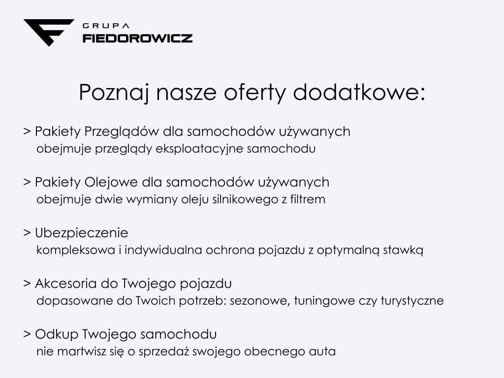 Asystent pasa ruchu, Poduszki boczne przednie, Poduszki boczne tylne, Czujnik deszczu, Czujnik zmierzchu, Isofix, Poduszka powietrzna chroniąca kolana, Poduszka powietrzna kierowcy, Poduszka powietrzna pasażera, Przyciemniane szyby, Wspomaganie kierownicy, Bluetooth