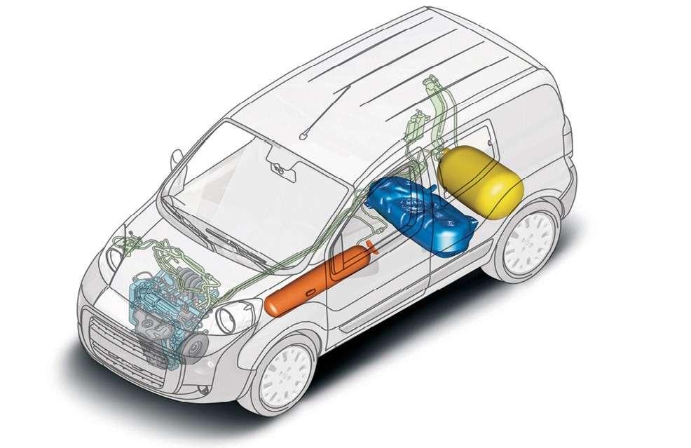Rozmieszczenie butli ze sprężonym gazem ziemnym w Fiacie Fiorino Natural Power. Metan może pochodzić ze źródeł odnawialnych.