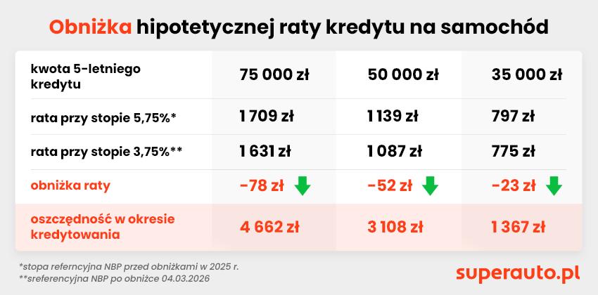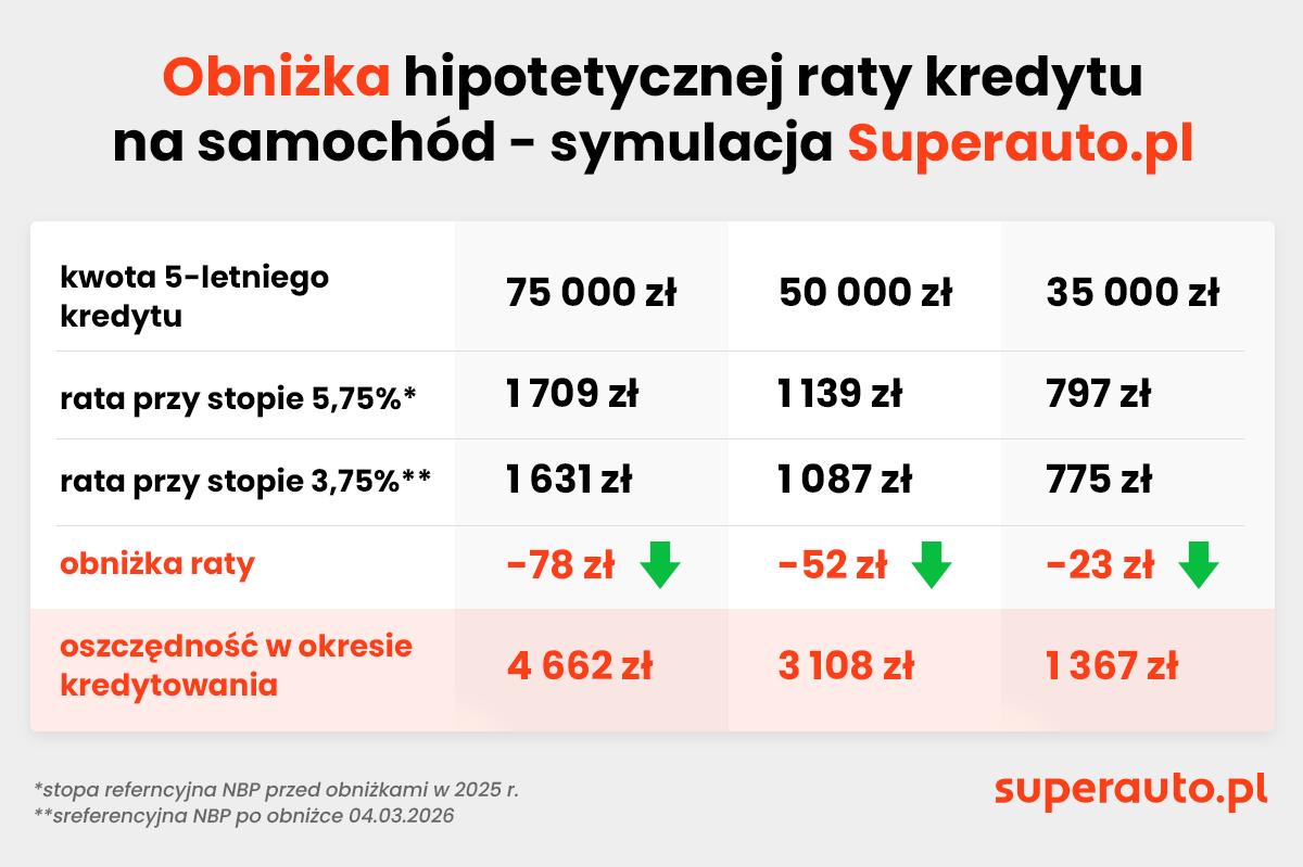 Z przeprowadzonej analizy wynika, że skala obniżki rat kredytowych jest mniejsza niż w przypadku leasingu, co w dużej mierze wynika z niższych przeciętnych kwot finansowania. Eksperci Superauto.pl oszacowali zmianę wysokości hipotetycznej raty 5-letniego kredytu dla trzech poziomów finansowania: 35 tys., 50 tys. oraz 75 tys. zł.