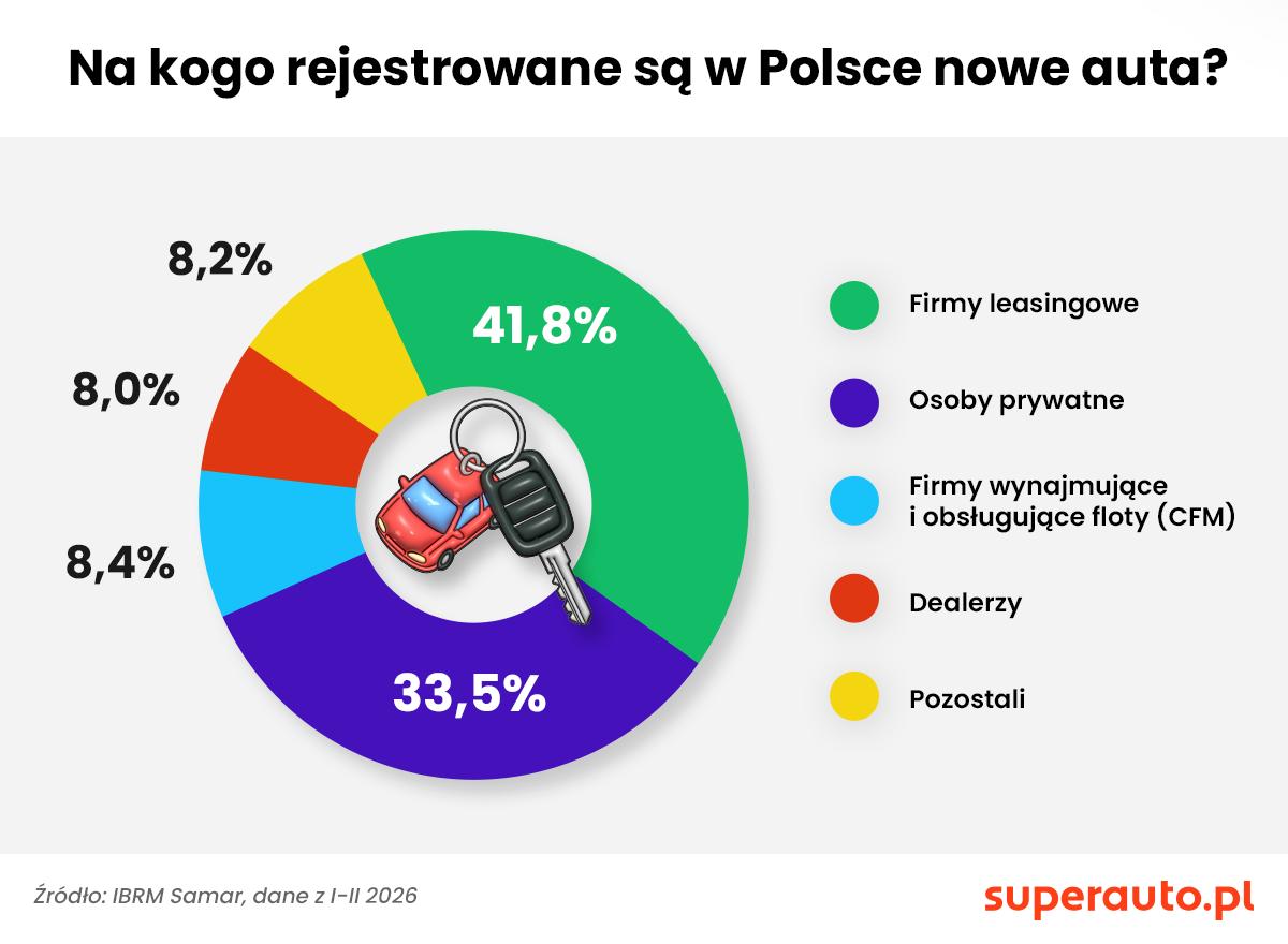 Leasing jest najpopularniejsza formą finansowania nowych aut w Polsce. Aż 42% rejestracji samochodów osobowych i dostawczych do 3,5 tony dokonanych w 2026 r. przypadło na firmy leasingowe -– wynika z danych IBRM Samar. Na drugim miejscu, z udziałem na poziomie 34%, znalazły się rejestracje na nabywców prywatnych lub jednoosobowe firmy, dokonujące zakupów za gotówkę lub na kredyt. Na trzecim miejscu znalazły się firmy świadczące usługę wynajmu długoterminowego i zarządzające flotami (CFM; część finansowania najmowanego jest też zawarta w pozycji "leasing").