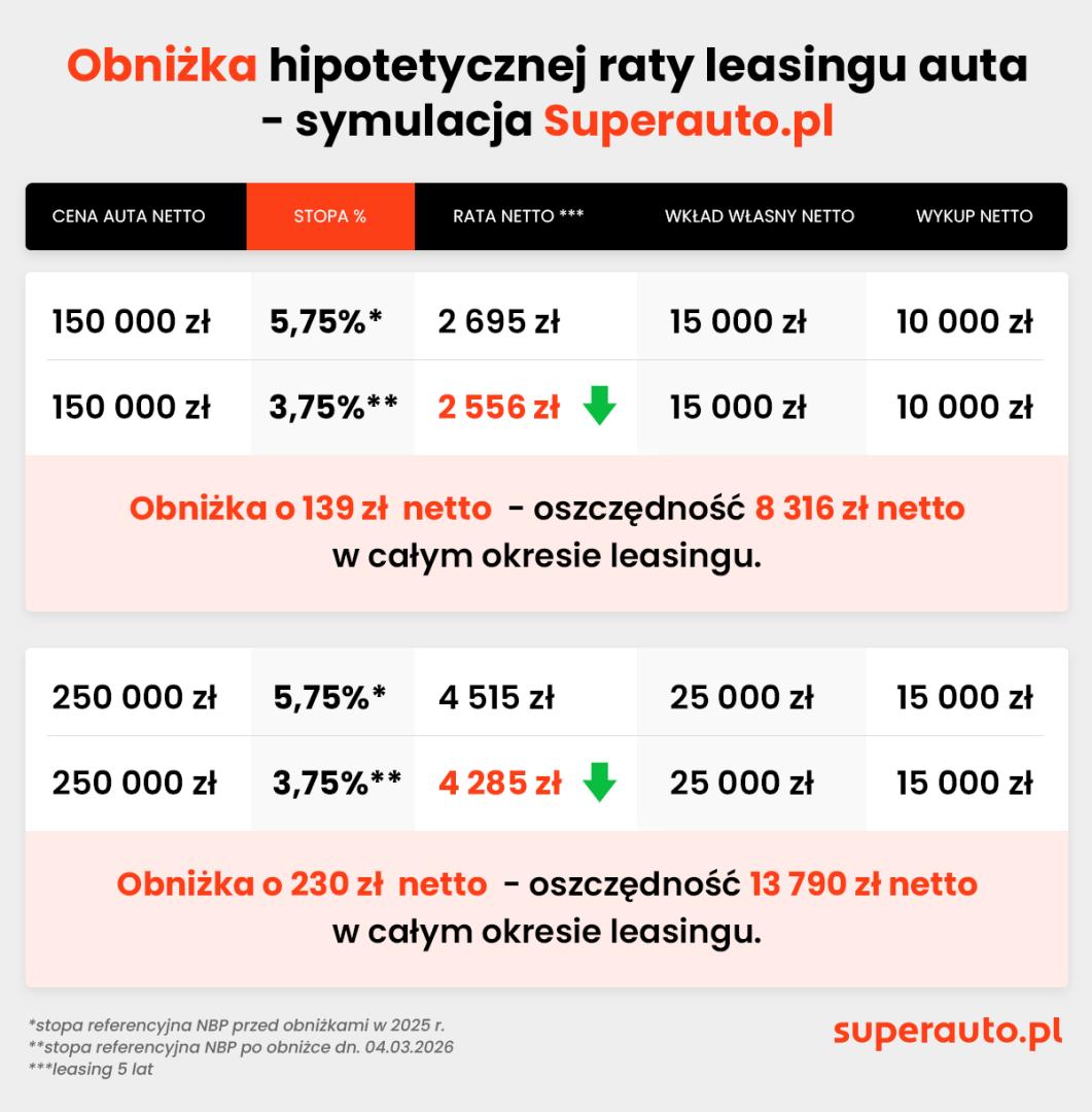 Z symulacji wynika, że w przypadku 5-letniego leasingu samochodu o wartości 150 tys. zł netto – zbliżonej do średniej ceny nowego auta na rynku – hipotetyczna miesięczna rata spadła dla przyjętych założeń z 2 695 zł do 2 556 zł netto, czyli o 139 zł netto (170 zł brutto). W całym okresie finansowania oznaczałoby to oszczędność na poziomie ok. 8,3 tys. zł netto.