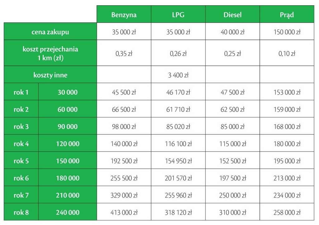 Czym jeździć najtaniej? Wszystko zależy od tego, jak długo chcemy jeździć oraz w jaki sposób wykorzystujemy samochód. Jeśli weźmiemy pod uwagę koszt zakupu oraz koszt eksploatacji, benzyna wygrywa tylko w pierwszym roku – koszt zakupu jest najniższy. W kolejnych latach pałeczkę przejmuje samochód zasilany LPG, a dopiero w 3. roku użytkowania oddaje ją dieslowi, który prowadzi w słupkach księgowych aż do czasu, gdy... mimo ponad trzykrotnie większej ceny zakupu najtańszy okazuje się samochód na prąd! Niestety, dzieje się to dopiero po przebiegu około 200 000 km, co jest pewną granicą wymiany auta na nowe. W Polsce w tej chwili brak ulg za zakup takiego elektrycznego auta, a szkoda, bo już teraz mógłby być ciekawą alternatywą dla miejskich samochodów służbowych.