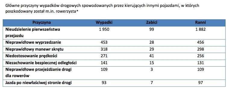 Rowerzyści znajdują się na drugim miejscu wśród ofiar wypadków po osobach podróżujących samochodami osobowymi. Według policyjnych statystyk w 2013 roku uczestniczyli oni w 4 723 wypadkach drogowych, w których zginęło 317 osób, a rany odniosły 4 573 osoby. Większość zdarzeń z udziałem kierowców jednośladów miała miejsce na obszarze zabudowanym (4 012) i spowodowana była przez innych użytkowników drogi, głównie kierowców aut osobowych. Z kolei wypadki na obszarze niezabudowanym pochłonęły stosunkowo więcej ofiar: w co piątym była ofiara śmiertelna, podczas gdy na obszarze zabudowanym w co dwudziestym drugim. Jedną z głównych przyczyn wypadków pozostaje niewystarczająca widoczność rowerzystów.