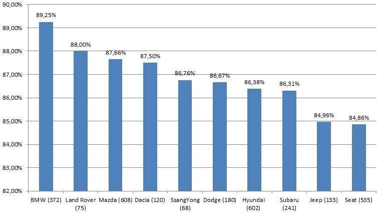 Na pierwszym miejscu wylądowała bawarska marka. Przeszło 89% użytkowników BMW deklaruje, że ich kolejnym autem będzie inny model tego producenta. Na drugim miejscu z wynikiem 88% uplasował się Land Rover, zaś na trzecim wylądowała Mazda. Dość dobry wynik po raz kolejny uzyskała Dacia – poza podium z wynikiem 87,5%.