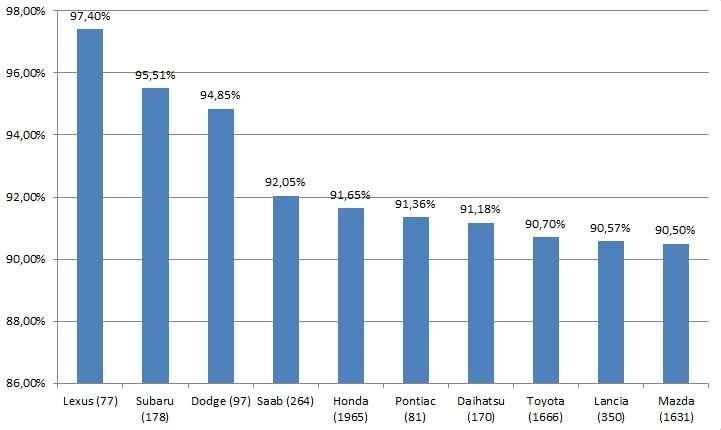 Najwyższym, bo ponad 97 procentowym zaufaniem cieszy się Lexus. Nic dziwnego, auta tej marki cechują się prestiżem, wysoką jakością, stosunkowo niewielką stratą wartości oraz małą awaryjnością. Na drugie miejsce wskoczyło Subaru z wynikiem 95,51%, a zaraz za nim uplasował się Dodge z wynikiem niewiele gorszym – 94,85%. Warto zwrócić uwagę na ilość głosów trzech marek japońskich, które uplasowały się na 5 (Honda), 8 (Toyota) oraz 10 (Mazda) miejscu.
