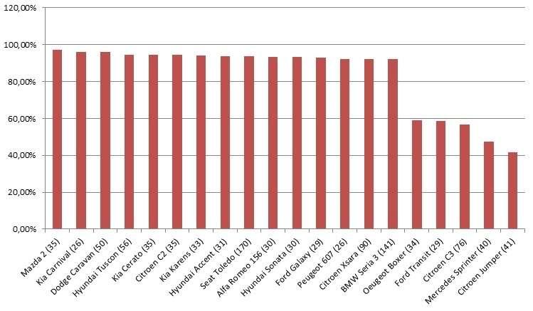 Na pierwszym miejscu znów wylądowała Mazda, a konkretniej jej niewielki model 2. Auto kupiłoby ponownie aż 97,14% obecnych właścicieli. Na drugie miejsce, z wynikiem 96,15% wskoczyła Kia Carnival. Widać koreańska myśl techniczna zyskuje uznanie w naszym kraju. Trzecie miejsce z wynikiem 96% przypadło modelowi Caravan produkcji Dodge’a. Na końcu tabeli z bardzo słabym wynikiem 41,46% wylądował Citroen Jumper. Niewiele lepszy wynik osiągnął Mercedes Sprinter, z którego zadowolonych jest zaledwie 47,50% naszych Czytelników. Zaskakująca jest trzecia od końca pozycja Citroena C3. Chęć ponownego zakupu zadeklarowało zaledwie 56,58% naszych Czytelników, którzy obecnie używają tego auta.