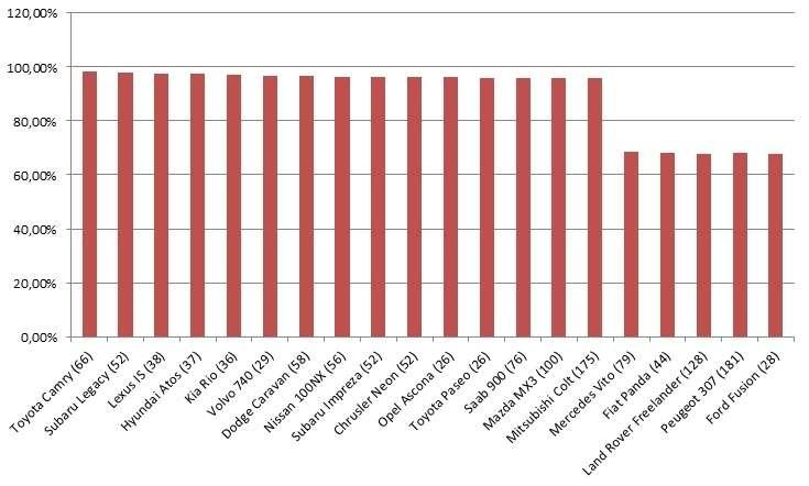 Jak widać pierwsza piętnastka jest bardzo wyrównana, zaś różnice procentowe naprawdę niewielkie. I tak na pierwsze miejsce trafiła Mazda z modelem 6. Chęć ponownego kupna tego modelu zadeklarowało 97,62% obecnych użytkowników. Niewiele gorszy wynik uzyskała Honda z modelem Jazz, którą kupiłoby ponownie 97,14% obecnych właścicielu. Na najniższym stopniu podium wylądował Fiat Linea, którego kupiłoby ponownie 96,77% kierowców. Świetną pozycję uzyskał Volkswagen CC z wynikiem 96,30%. Co ciekawe, na końcu zestawienia wylądowała Toyota Yaris, którą ponownie kupiłoby zaledwie 57,45% obecnych właścicieli. W niewiele lepszej sytuacji jest Subaru Forester, którego kupiłoby ponownie 58,82 obecnych użytkowników.