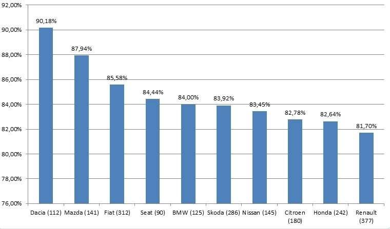 Co ciekawe, ogromnym zaufaniem cieszy się Dacia, która wychodzi na lidera w grupie samochodów stosunkowo nowych. Na drugie miejsce wskoczyła Mazda z wynikiem niespełna 88%.