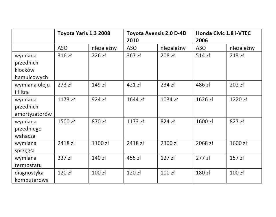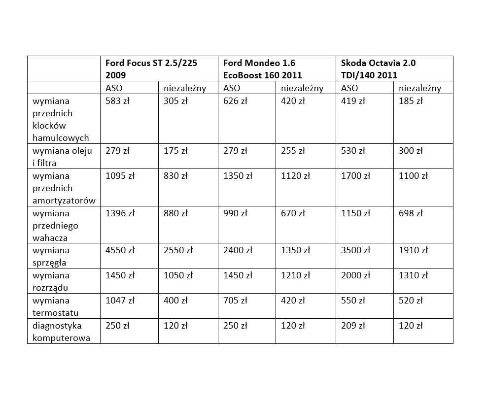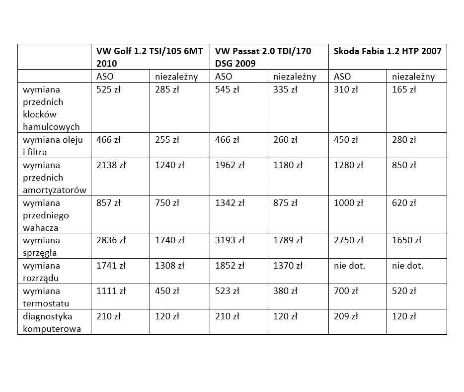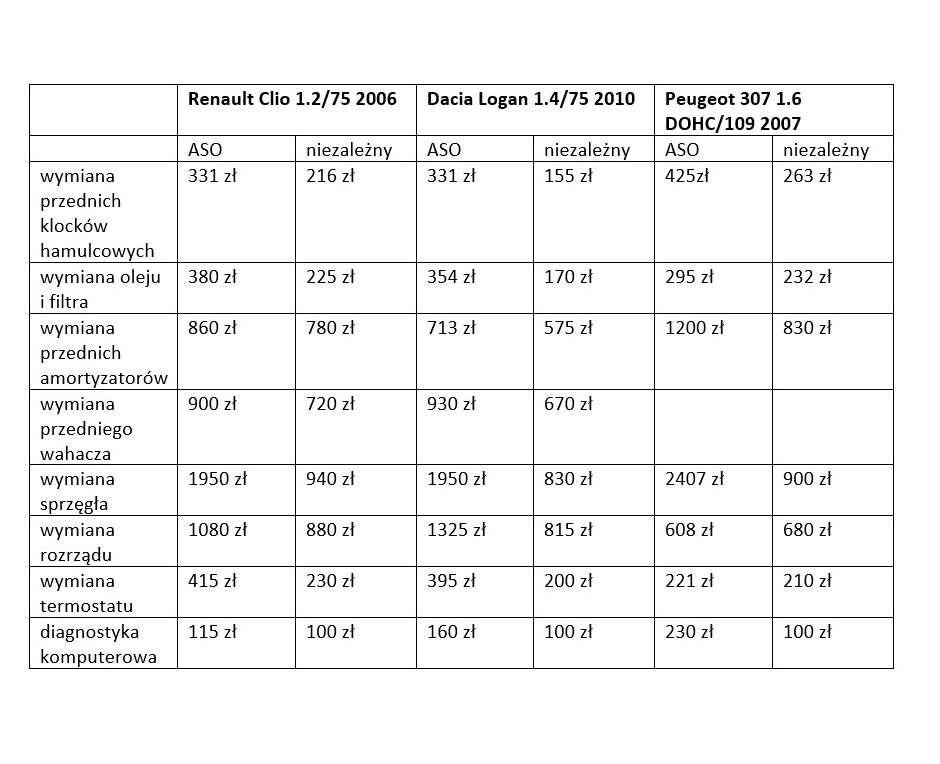 I w końcu dochodzimy do kwestii cen, które mimo wszystko, wciąż mają duży wpływ na nasze wybory. Aby przekonać się, jak kształtują się ceny w różnego rodzaju serwisach, porównaliśmy koszty kilku typowych usług serwisowych dla kilkunastu popularnych na rynku marek/modeli. Okazuje się, że ceny usług w ASO (robocizna + użyte części) są od kilkunastu do nawet 50% wyższe niż w niezależnych warsztatach. Porównując ceny usług prosiliśmy o wycenę usługi przy użyciu oryginalnych części (ASO) oraz zamienników, ale z najwyższych półek cenowych (w serwisach niezależnych).